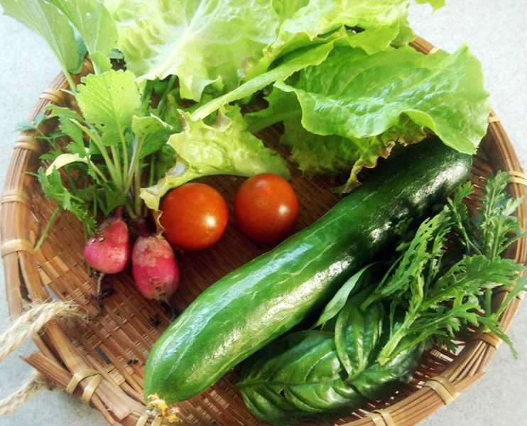 今朝の収穫  ​ミニトマト2個・二十日大根2個・胡瓜1本(22本目)