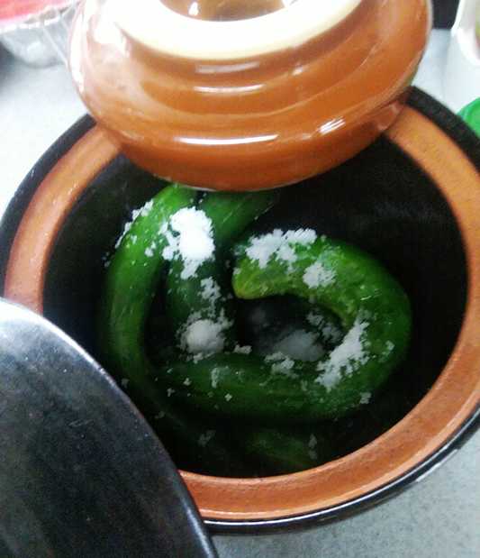 胡瓜500gに塩30gをふりかけて1晩重石をして漬けて、翌日汁を捨てる