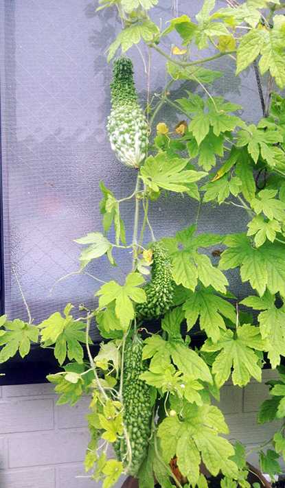 朝、雨の中ベランダのゴーヤを見に行ったら