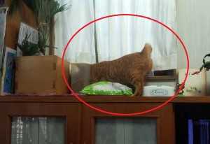 フードの入っている容器を引っ張り出そうとしている