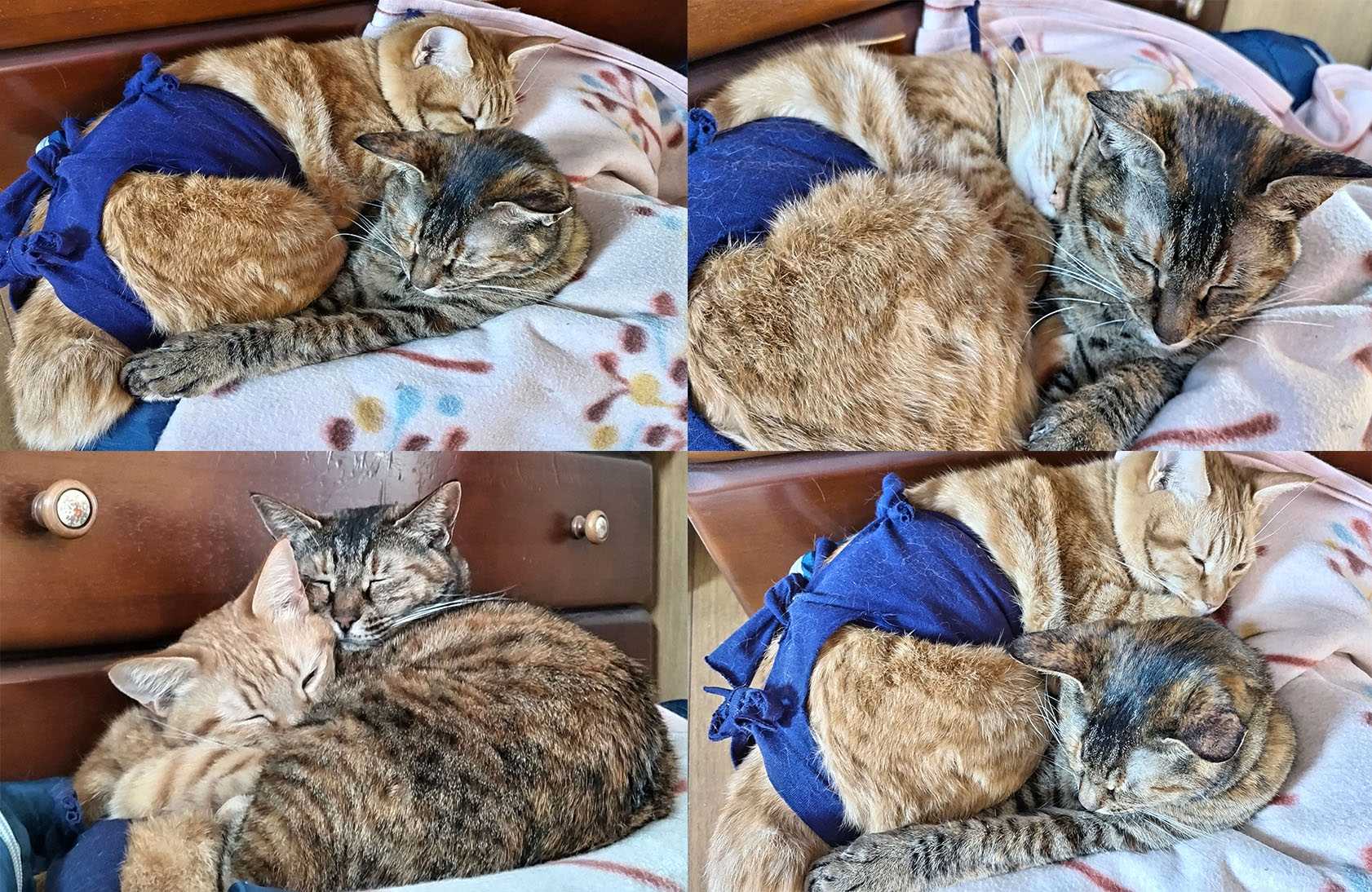 りんちゃんが寝ていたところにくうちゃんが割り込んできたようで上に乗っかっている状態