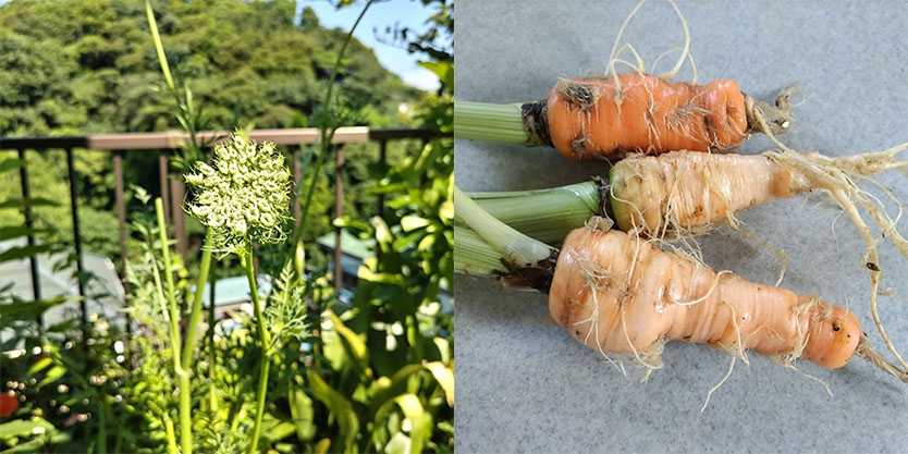 伸びに伸びて花を咲かせた人参 抜いてみたら固そうな人参が・・・