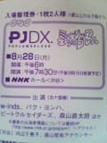 めっけちゃった。ヨンハの通販振込用紙のお店。 今日は、待ちに待ったPOP JAM収録の日。6:00開場、7:30開演と言う事で、座席も当日抽選と言う事だったので、家にいても落ち着かないので、午前中仕事に行った。 そして、チングのNさんと駅で待ち合わせをして、まじゅは、原宿へ向かった。目的は・・・Snoopy Town。付き合わせてしまった。ホントは、いとこの出産祝いを買おうと思ったけど、これと言ったものは見つからなかった。 でも、そのおかげで、「あの写真のお店、裏原らしいよ」という事で、ほとんど勘だけを頼りに、歩いた。でも、2本目に曲がった道でめっかっちゃつたではあ~りませんかこれは、偶然としか言いようがない。 戸惑いながらも、お店の中に入り、初めは普通の客のようにアクセサリーを見ていたけど、「聞くっきゃない」と思い、ヨンハが来店した時の話をお店のお兄さんに聞いてみた。ヨンハは、写真にも写っているぬいぐるみを2Fで見たりしたらしいが、お買い求めにはならなかったようだ。そして、お兄さんに断って写真を撮らせていただいた。 それ程やっきになって探していたわけでもないのに、これは、今日の第1の収穫だね。 そして、そろそろNHKホールへと向かうことにした。 6:00を既に少し回っていたけど、あまり列は進んではいなかった。偶然前後に並んだ、Nさんのチングと一緒に6人で席を取ることにした。それが功を奏したのか(字はあってる?)とってもいい席で、これまで私の経験した事のないほどの席が当たった。双眼鏡なんて必要なし。 いよいよ、収録開始。名前を聞いたら誰でも知ってるようなスターや、中にはこれからの新人や、なんと19組20曲も聴くことが出来た。「ただでこんなにいいの?」ってくらい・・・。 ヨンハはとりで、おおとりはコブクロ。2曲歌った。いいねぇ、コブクロ。勿論、ヨンハも・・・。予想通り、新曲「君が最高」を歌った。これが、緊張するんだな、見てるほうが・・・。なんせ(たぶん)初めてお客さんの前で歌うんでしょいつもながら、私も緊張。曲名からしてバラードではないとは思ったけど、ダンスはどうかなと、久し振りに見てみたいなと思っていたけど、あまり動きはなかった。でも、あの手の振りは、みんなでコンサートの時にやるんだろうな。1・2・3。 あっという間で、終わってみたら衣装などあまり覚えていなかった。トップスの印象がなじぇかあまりない。首に黒っぽいスト-ルを巻いていたことは覚えてる。ボトムスは、デニムに白のベルト、黒のあれはブーツかな髪は、今までよりかなり短め。でも、ミニホの印象ほど変じゃなかったね。うん、やっぱりヨンハはかわいいよ。 今日は、歌しか聴けなかったけど、20分ほどインタビューを別撮りしたという事だったのでOnAirが楽しみ。でも、放送日は教えてくれなかった。 最後に、間違えて、降りる駅に止まらないに乗ってしまい、1駅戻る羽目になってしまったが、それを差し引いても今日は、いい1日だった。いい夏の思い出になった。