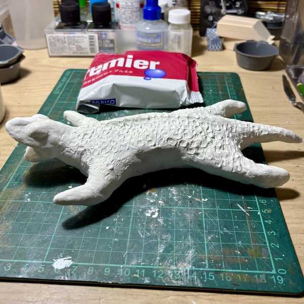 石粉粘土が乾いたのでさらに肉付けを拡張して行きます。目玉や四肢、尾などを付け足して…