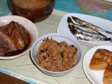 会社の『着ぐるみ』がお勧めするから作ってみた(笑)塩ふき昆布とツナ缶の炊き込みご飯♪メザシ、豚の角煮、納豆の揚げ包み焼き、大根のお味噌汁めっちゃ和風(爆)フジッコ 塩ふき昆布 小袋 30g【イージャパンモール】