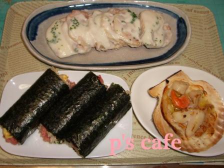 ホタテのニンニクオイル焼きと恵方巻きこちらはカットした巻物うちで使ってるお酢はミツカン 山吹なので黒いさらに砂糖も三温糖だから(笑)