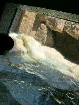 やんちゃ坊主のホッキョクグマロッシー、元気に泳ぎ回っていた。メスのバニラちゃんと泳ぎたいようで、時々甘えたポーズで誘っていた。他の場所を見に行った後で見たら、バニラちゃんも一緒に泳いでいた(ロッシーに水中でからまれていたと表現する方が正しいか?)