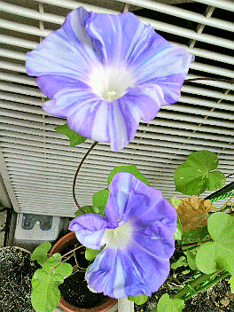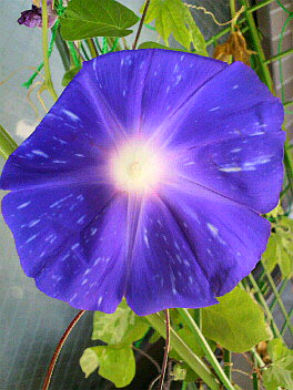 もうすぐ夏も終わり。だけどベランダは晴れると普通に暑いので、ゴーヤも朝顔もまだ現役。今度の花は、無地と絞りを足して2で割ったような模様。ある意味どっち付かず感が珍しいような?