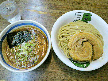 家から歩いて5分ほどの所にある店。うどんのようなボリュームある太麺なので、主に男性に人気のようだ。スープもこってり系のようだけど、この日は暑かったのでつけ麺を選択。麺の量だけでなく、背油系と魚介ダシと選べるのも嬉しい。