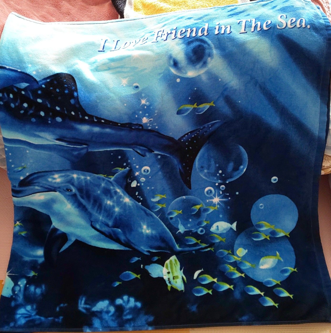 我が家のバスタオルがボロくなって買い替えたいと思っていた頃に旅行に行ったので、安い訳でもないのに購入。バスタオルだけど、夏の寝具のタオルケットにしてもかまわないぐらいの大きさだ。