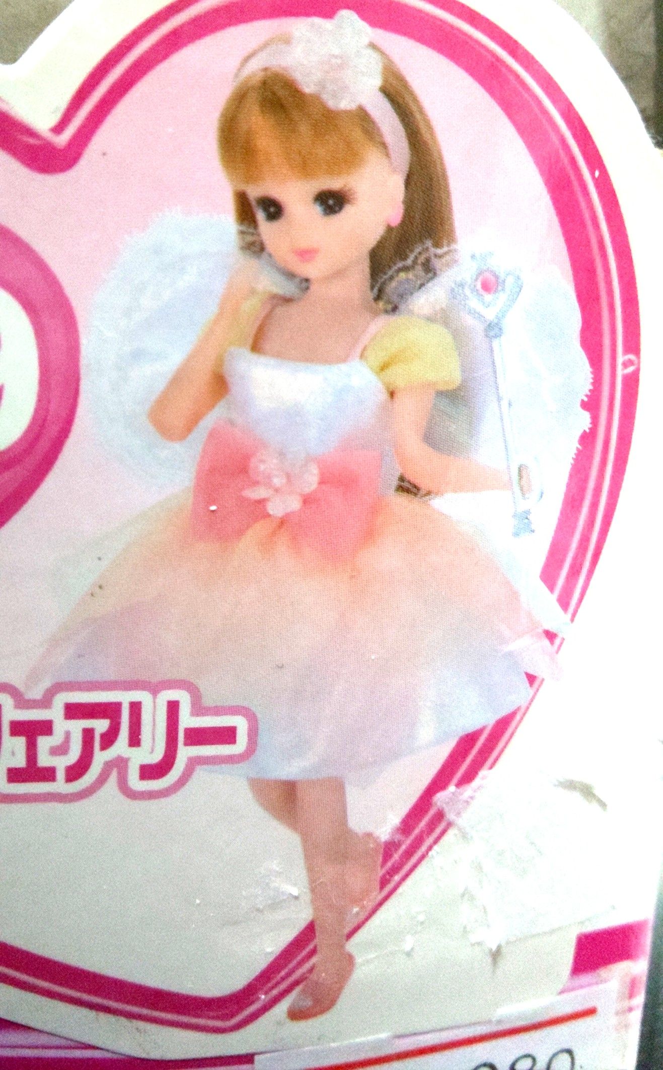 1月に閉店となった昔ながらのおもちゃ屋でゲット。しかし不良品くさい部分があちこちにあり、まずピアスが付いてないし、スカートの裏が汚れていた。ピアスは代わりがあるから何とかなるけど、ステッキのハート部分に、キラキラパーツが付いてない(泣)ヘアバンドが経年劣化で?ゴムが伸びっぱなしになってしまった。靴は足への色移りを防ぐために、あえて他の種類のサンダルにした。せっかくの可愛いドレスなのに、色々残念だ。