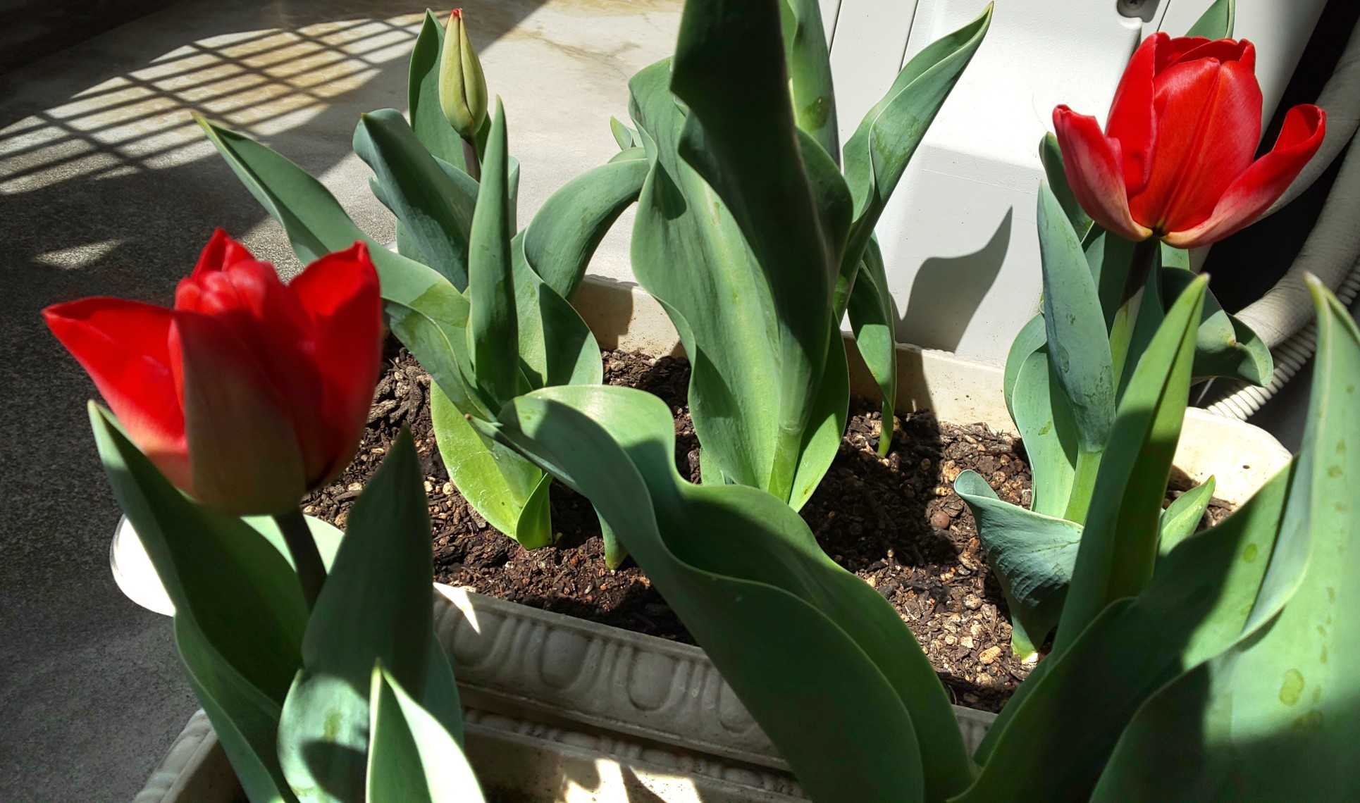 冬から芽を出していたチューリップ、いよいよつぼみが出てきた。やっぱり赤が開花一番乗りになりそうだ。