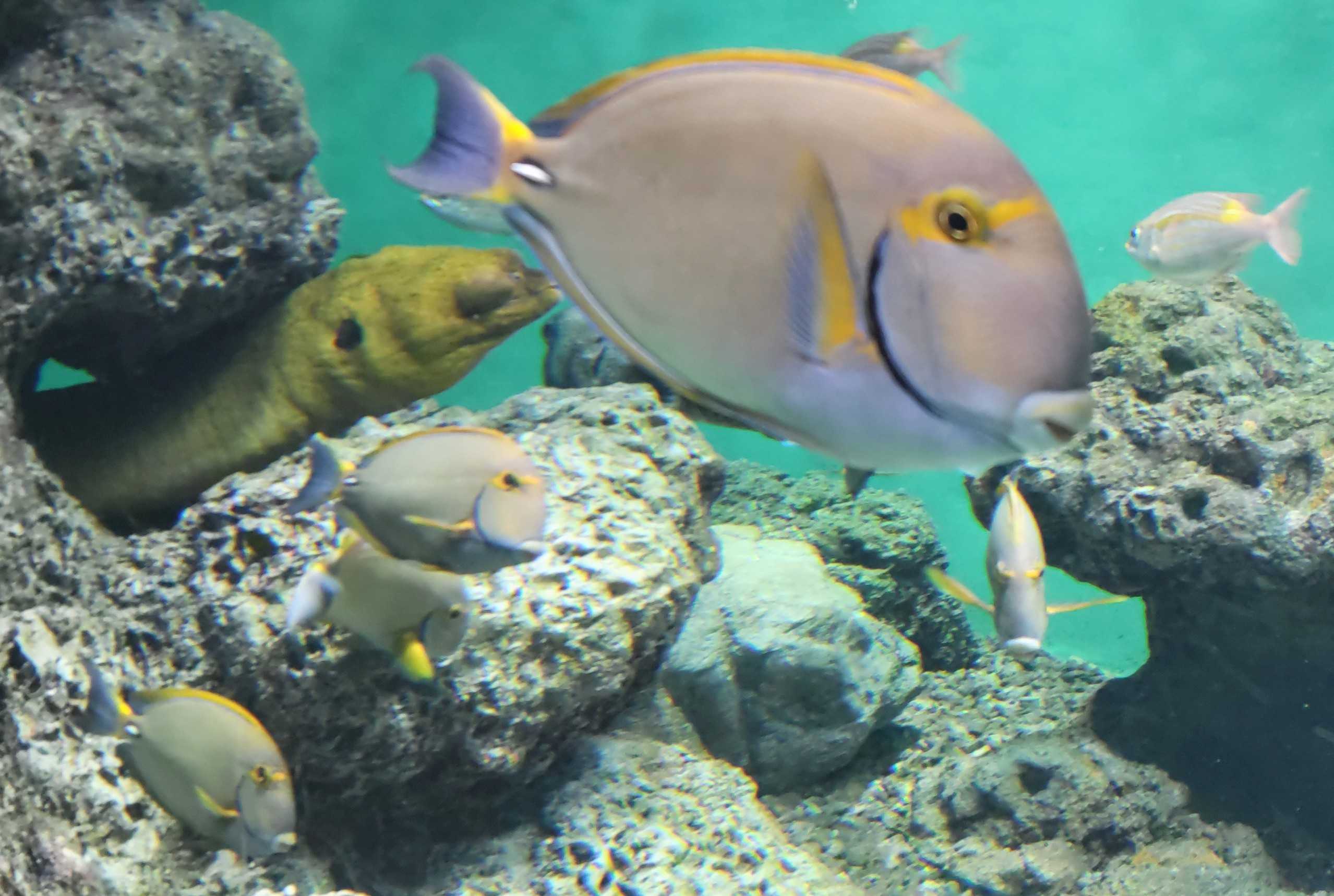 写真1枚目はドクウツボ。さすがに泳いでいる所は見られなかったけど、コレを見てぬいぐるみを買う事に決めた。でっかい魚は名称不明(テングハギか?)一覧表を見ても、近い魚がどれなのかわからなかった。2枚目はヒメテングハギと、奥の赤い魚はアカマツカサ。頭のトンガリがすごく特徴的だ。