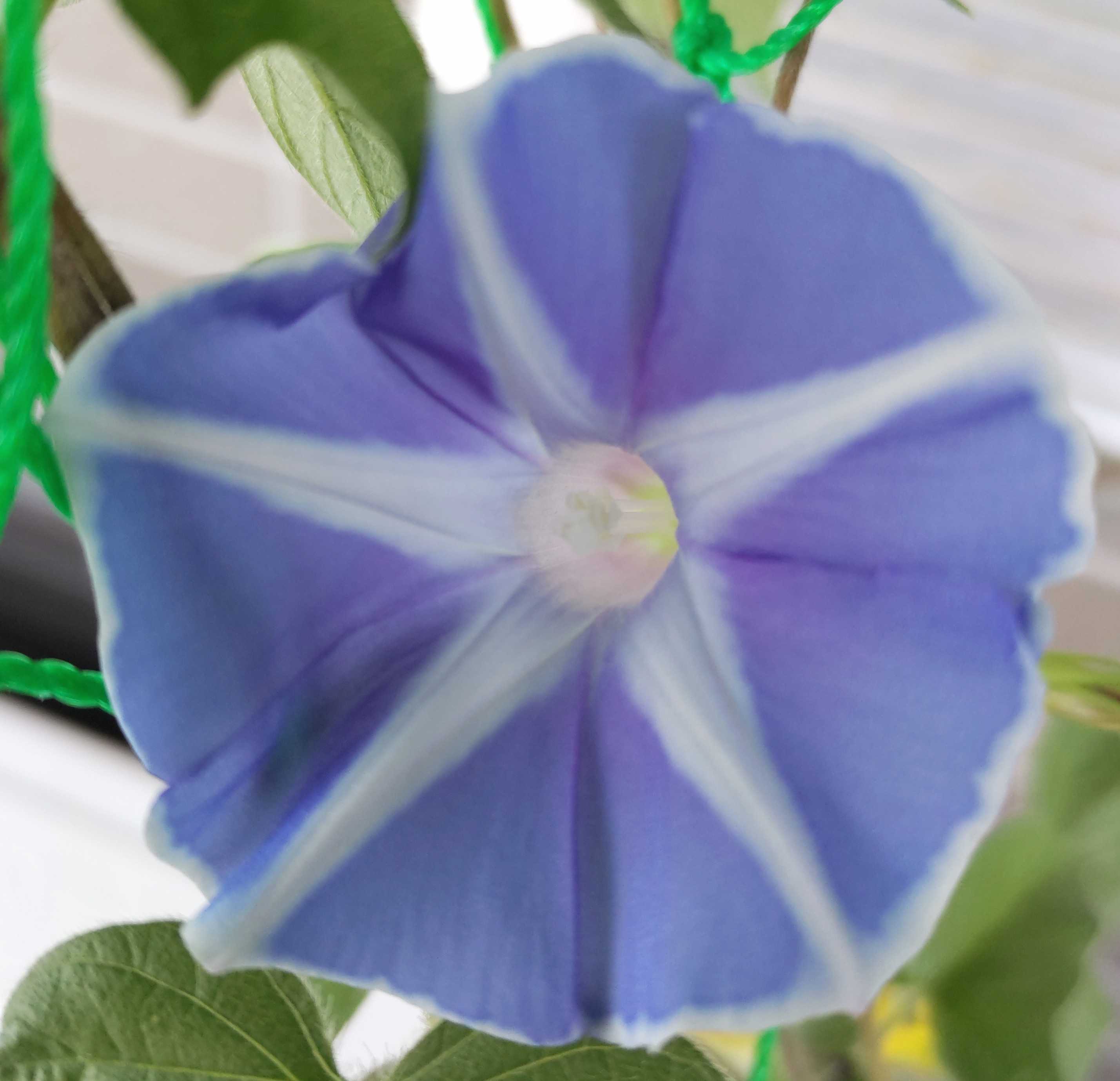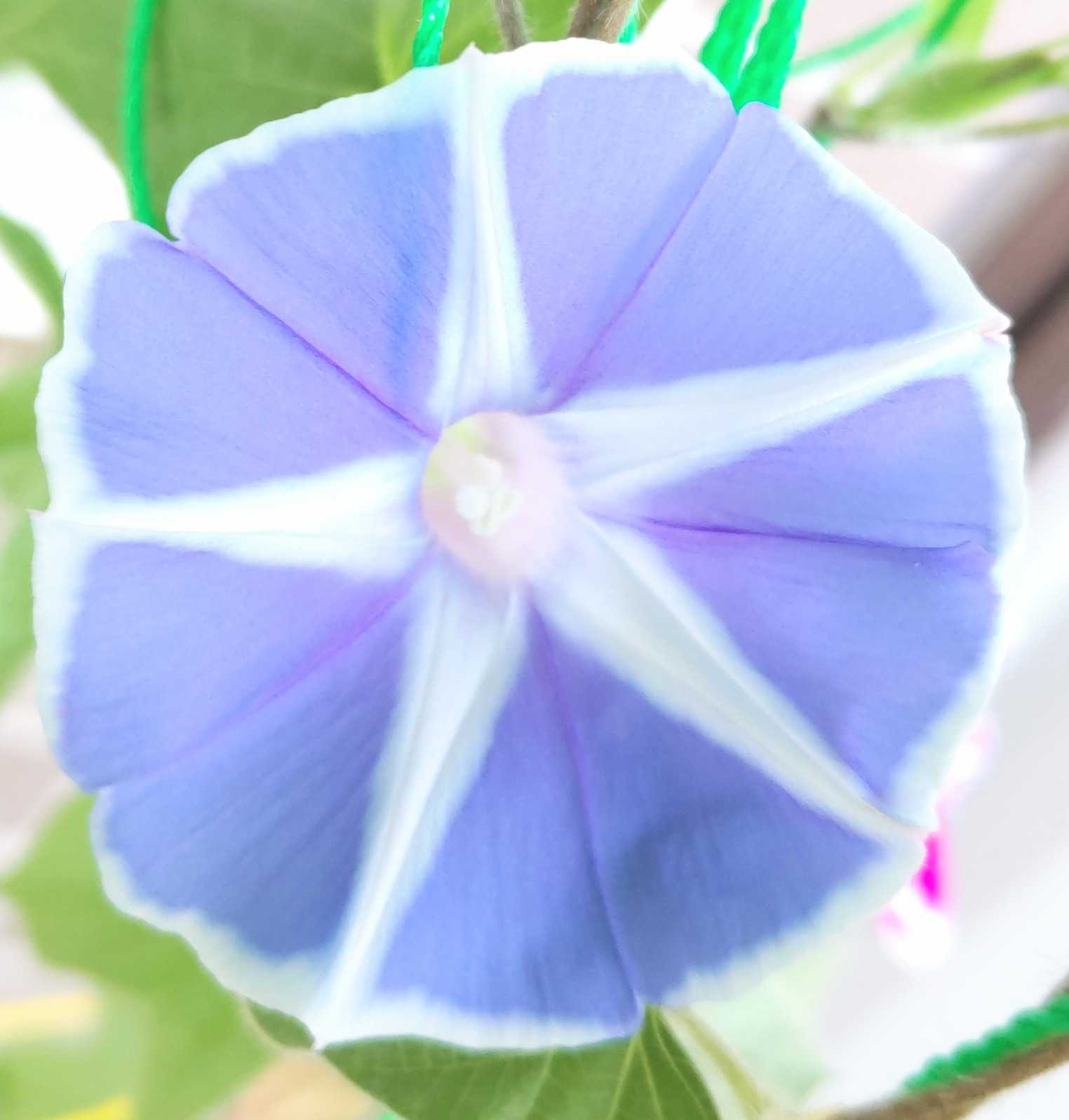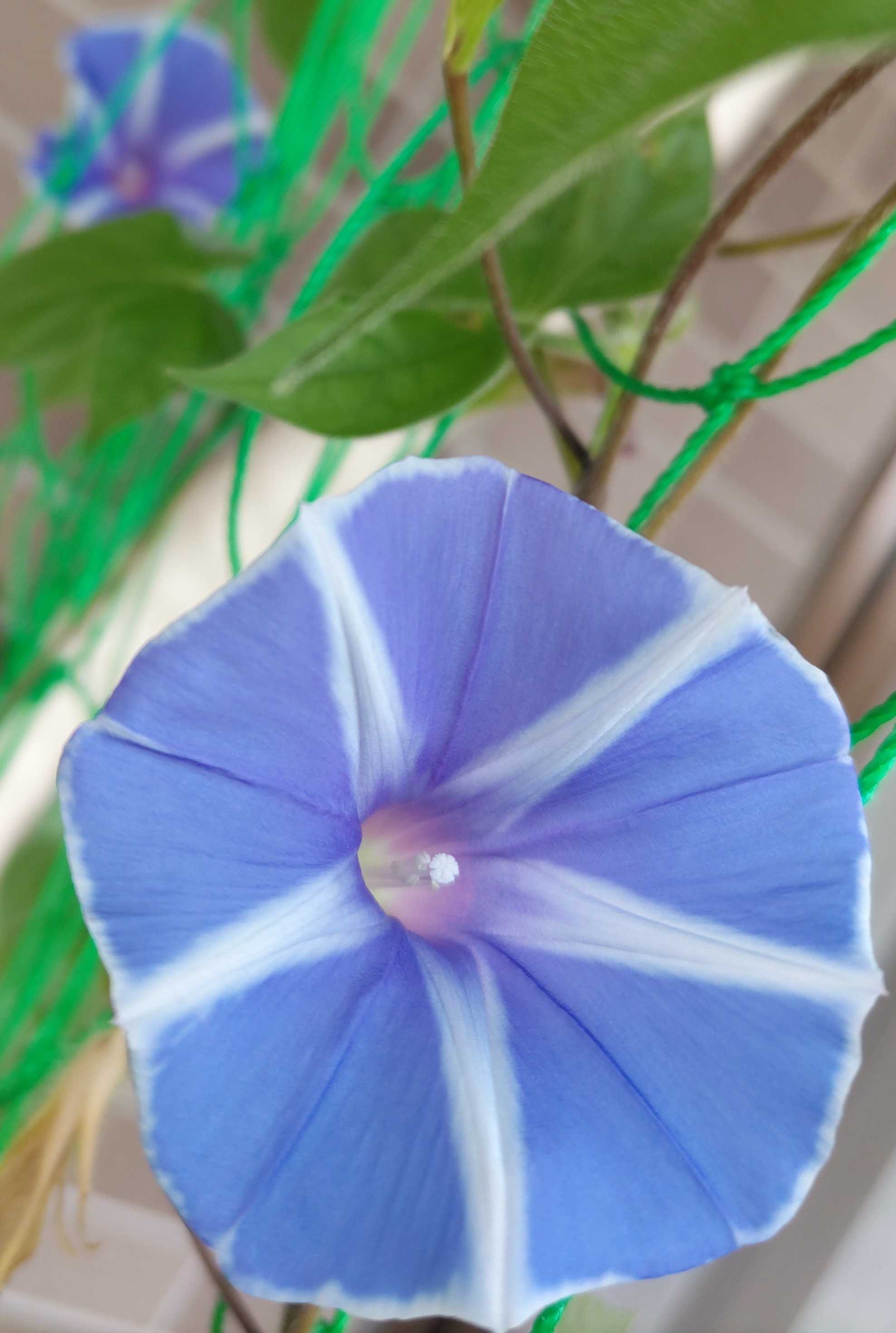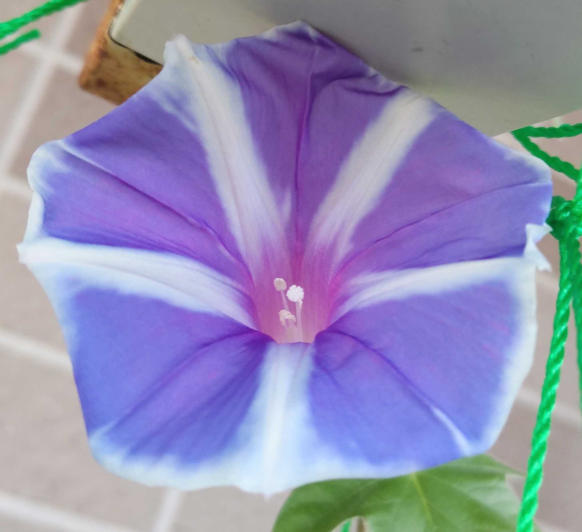 最初に咲いた青紫のアサガオと色は同じだけど、白い部分の面積が少なめのが開花した。これはこれで美しい。狂ったように暑いマッドネスサマーでも頑張っているアサガオを、心の底から尊敬してしまう。