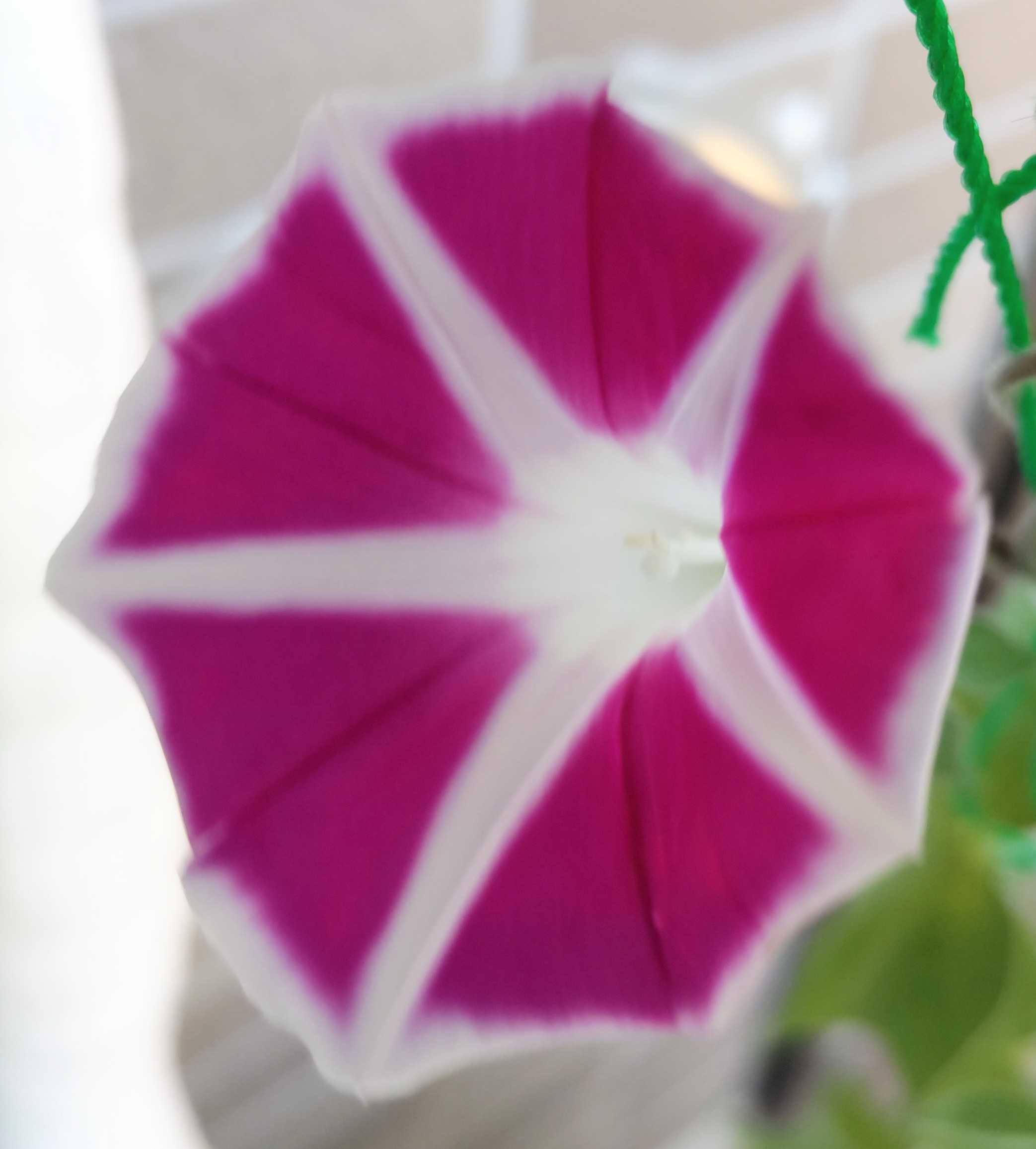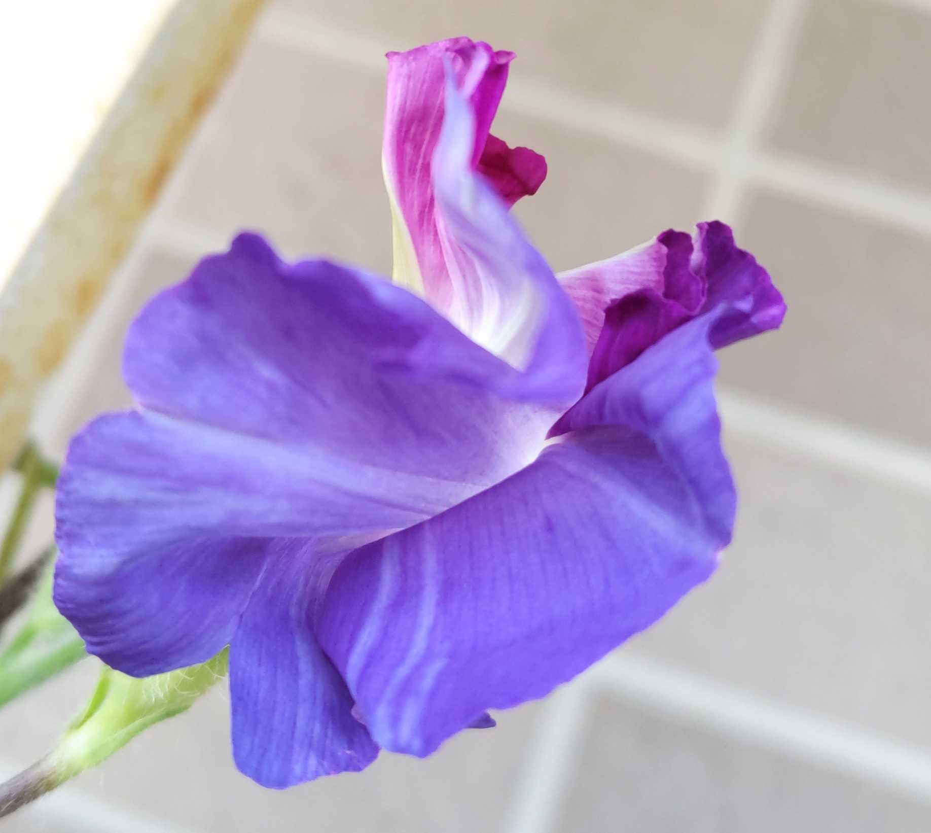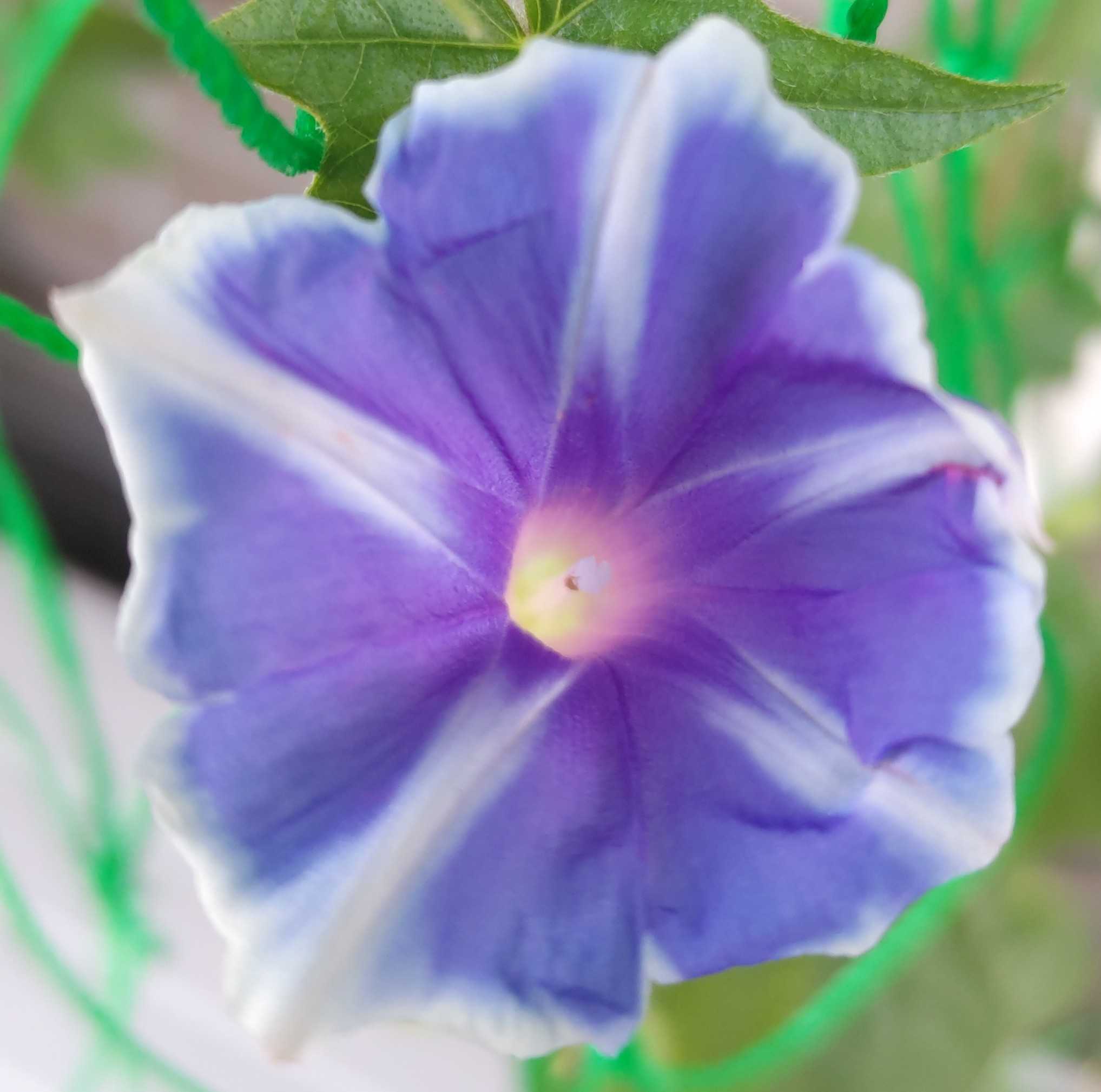 今日もダイソーアサガオは通常営業、もとい開花しているのが嬉しい。かすり模様のアサガオ、上に行くにしたがって、だんだん色のある面積が少なくなっているような・・・?