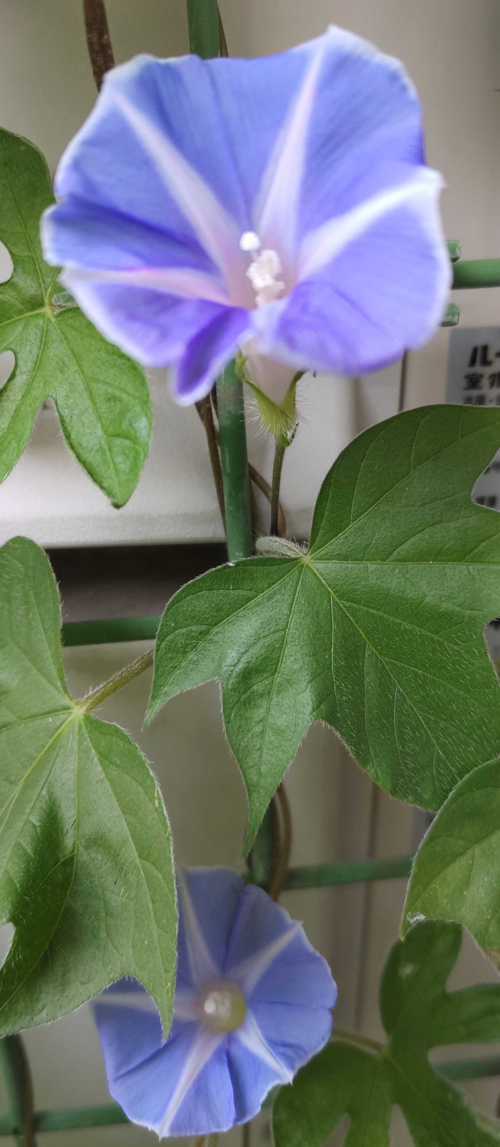 今日は赤ピンクのアサガオがお休みだった代わりに、青&紫のダイソーアサガオが再び開花。かすり模様のアサガオは、つるが上に行くほど色が白くなっているような気がする。