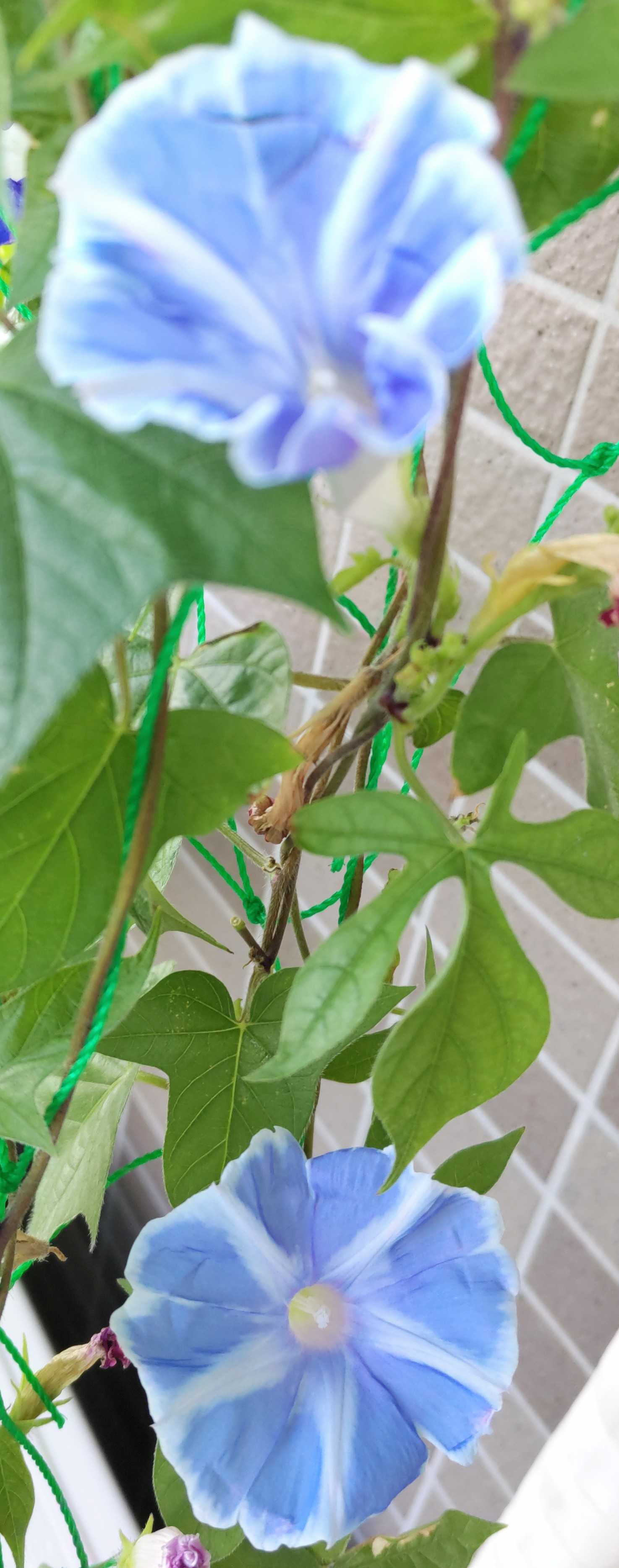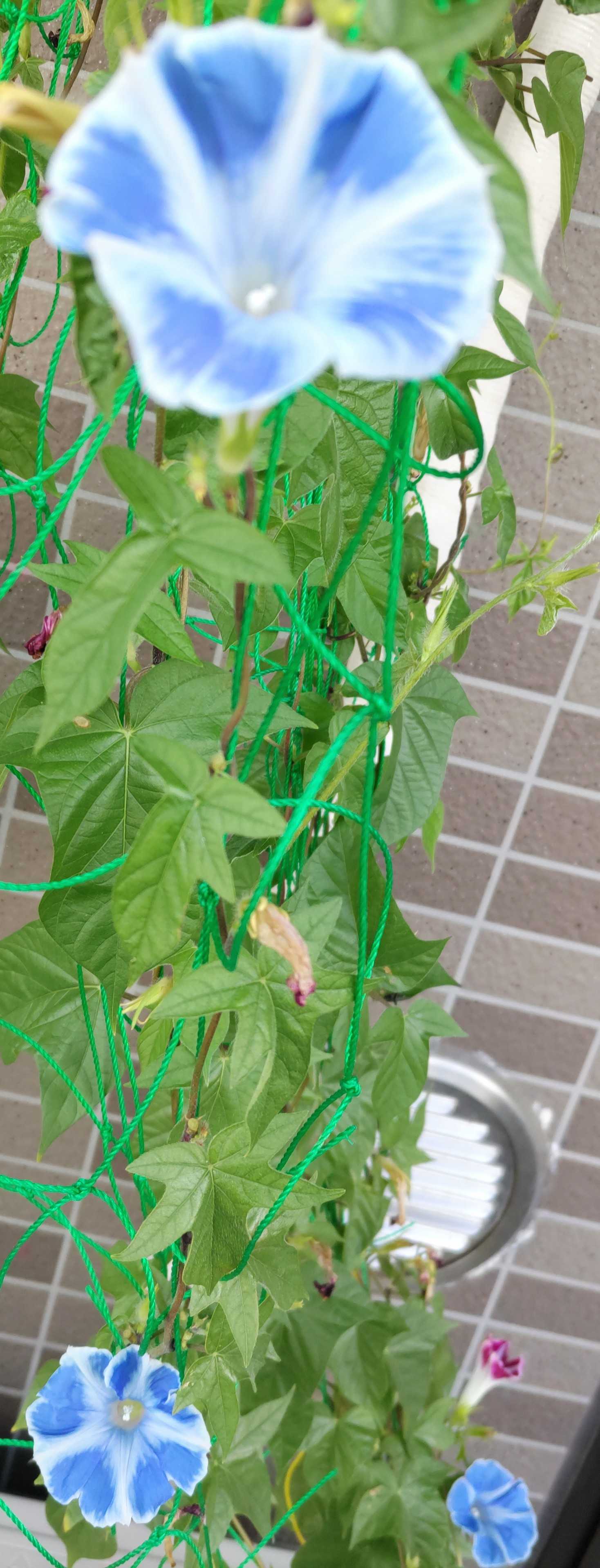 昼頃ににわか雨があったからか、ギラついて暑いのが少しマシになったおかげで午後の窓開放&部屋掃除が先週より少し楽だった。それでもまだエアコン要らずの気温&湿度には程遠い。ここ2~3日は開花数がそんなに多くなかったけど、今日は25輪と開花ラッシュがまた来た。薄ピンクのアサガオが半数だったけど、赤ピンクや暁の海(写真3枚目)もまだまだ頑張ってくれている。エアコンと同じく、頑張れアサガオ!