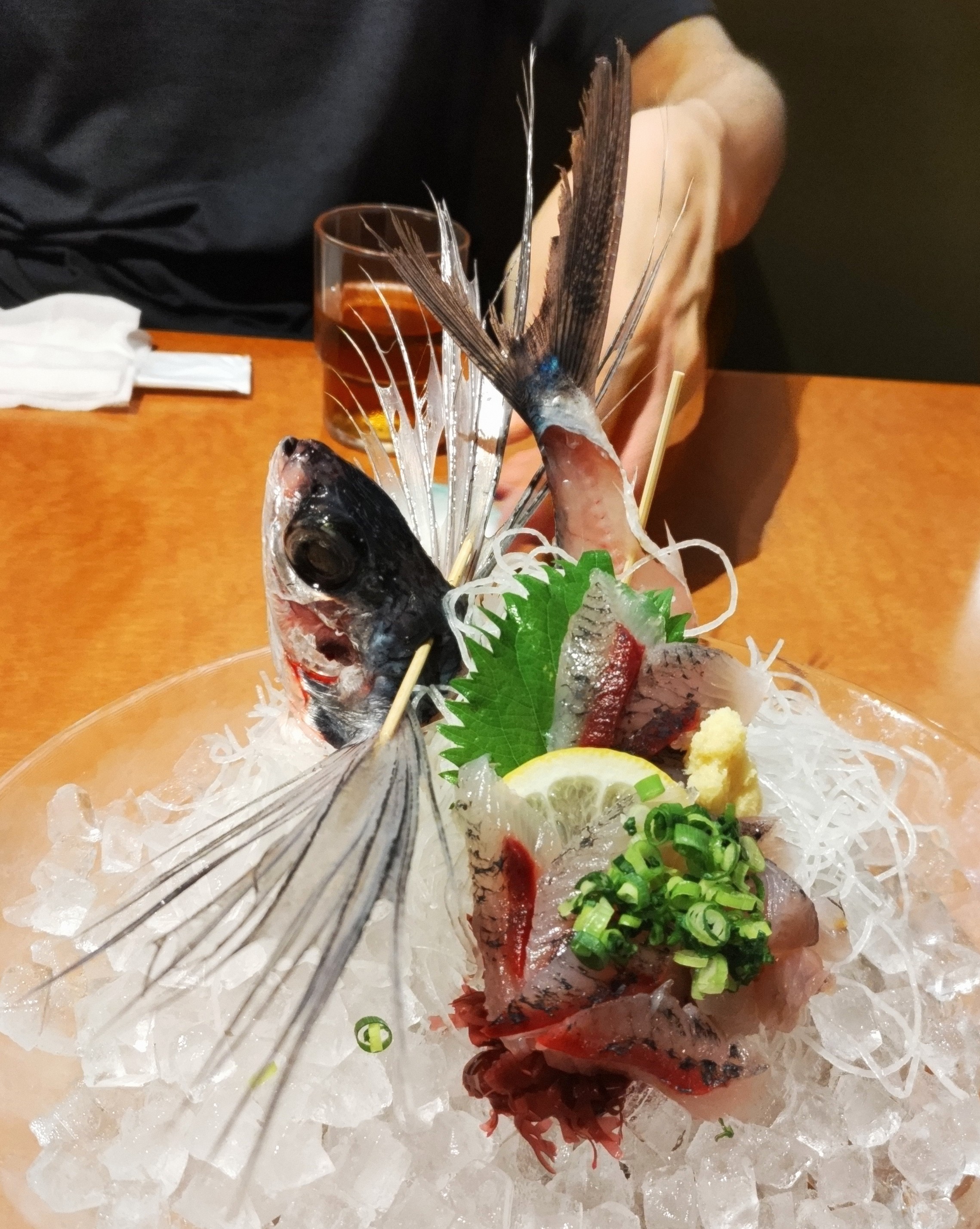 寿司や焼き魚で食べた事はあるけど、刺身では初めてだった。映える盛り付けで、それに見合う味わいが最高だった。見ようによっては、磔になってるようにも見えるが…?