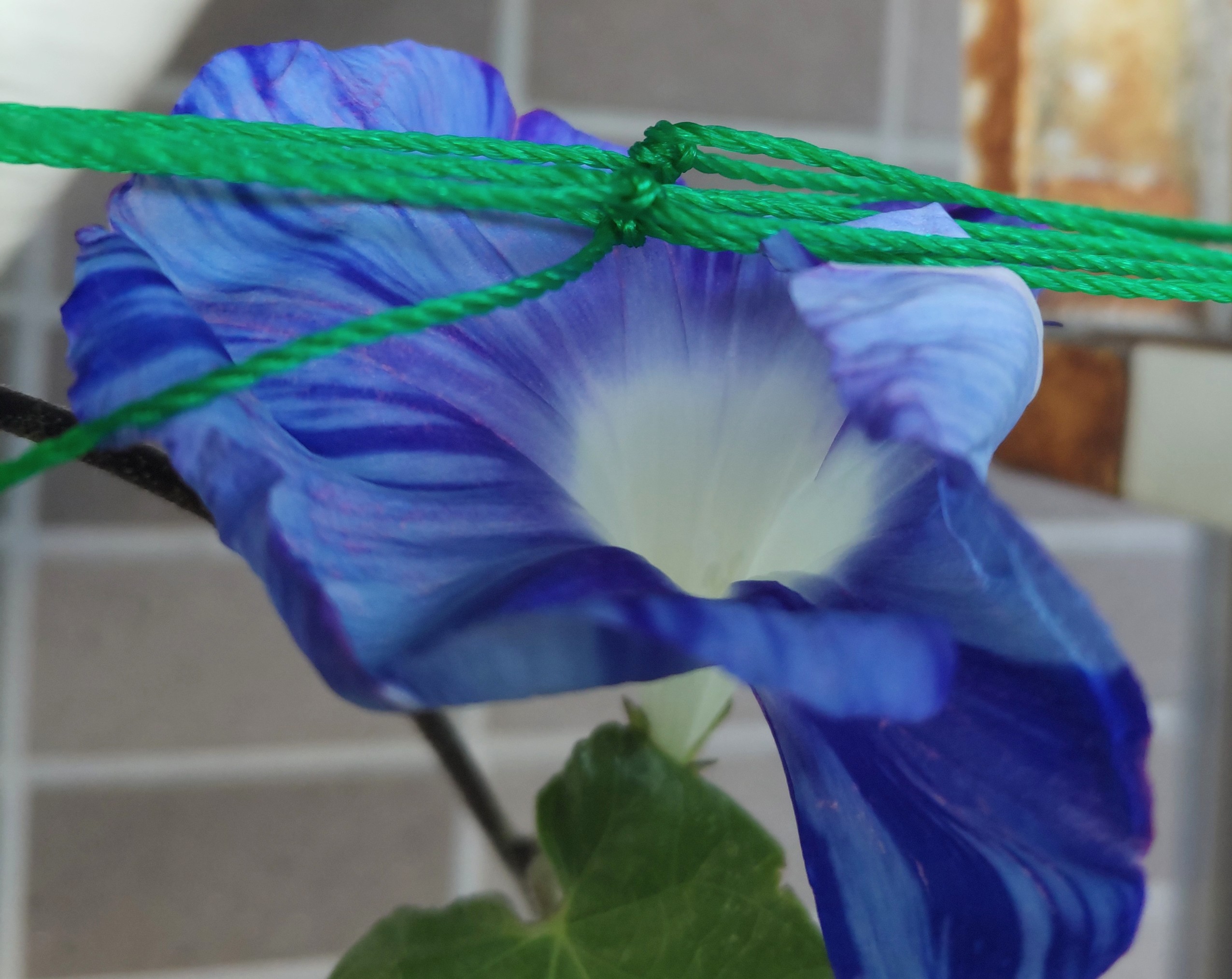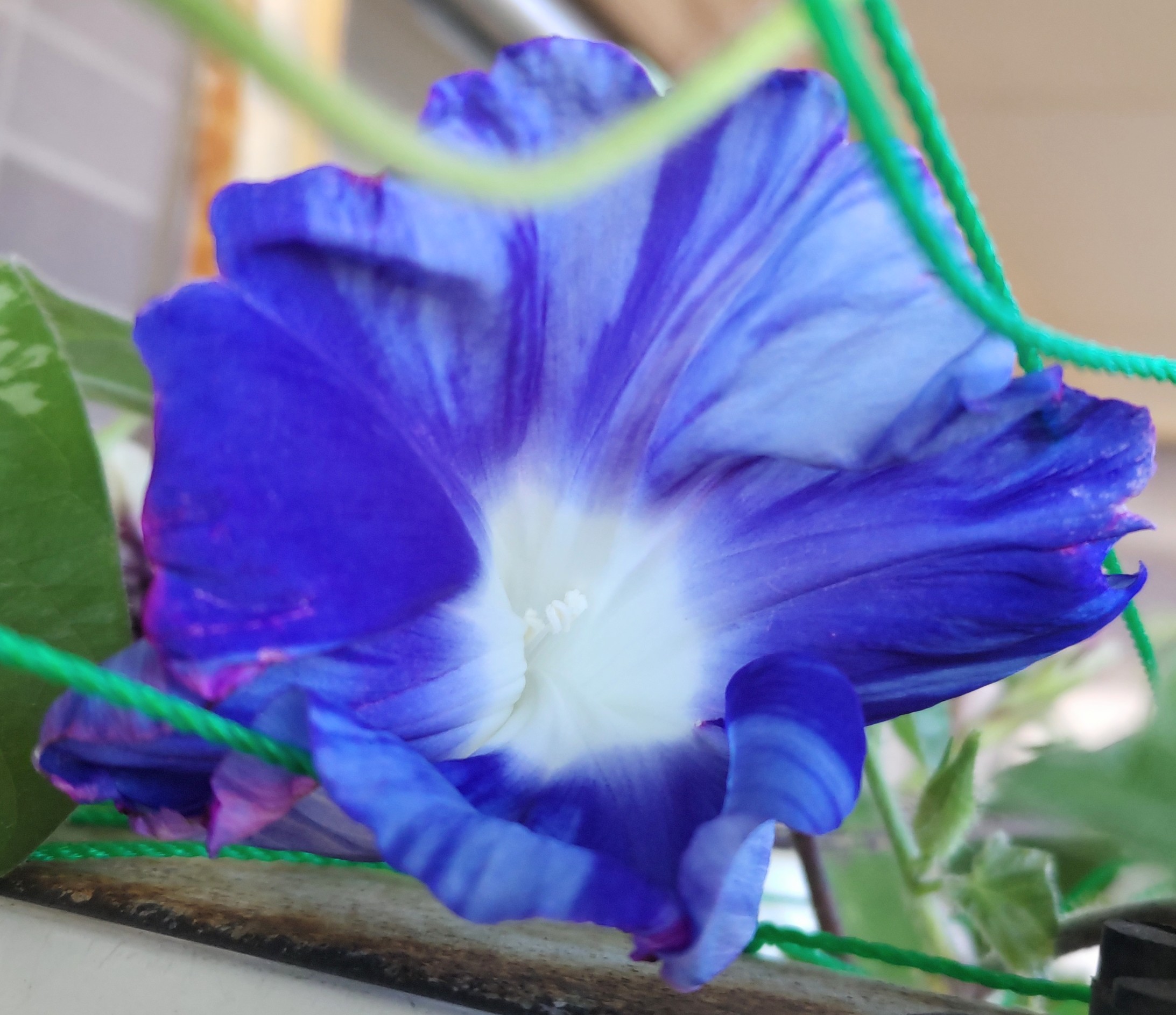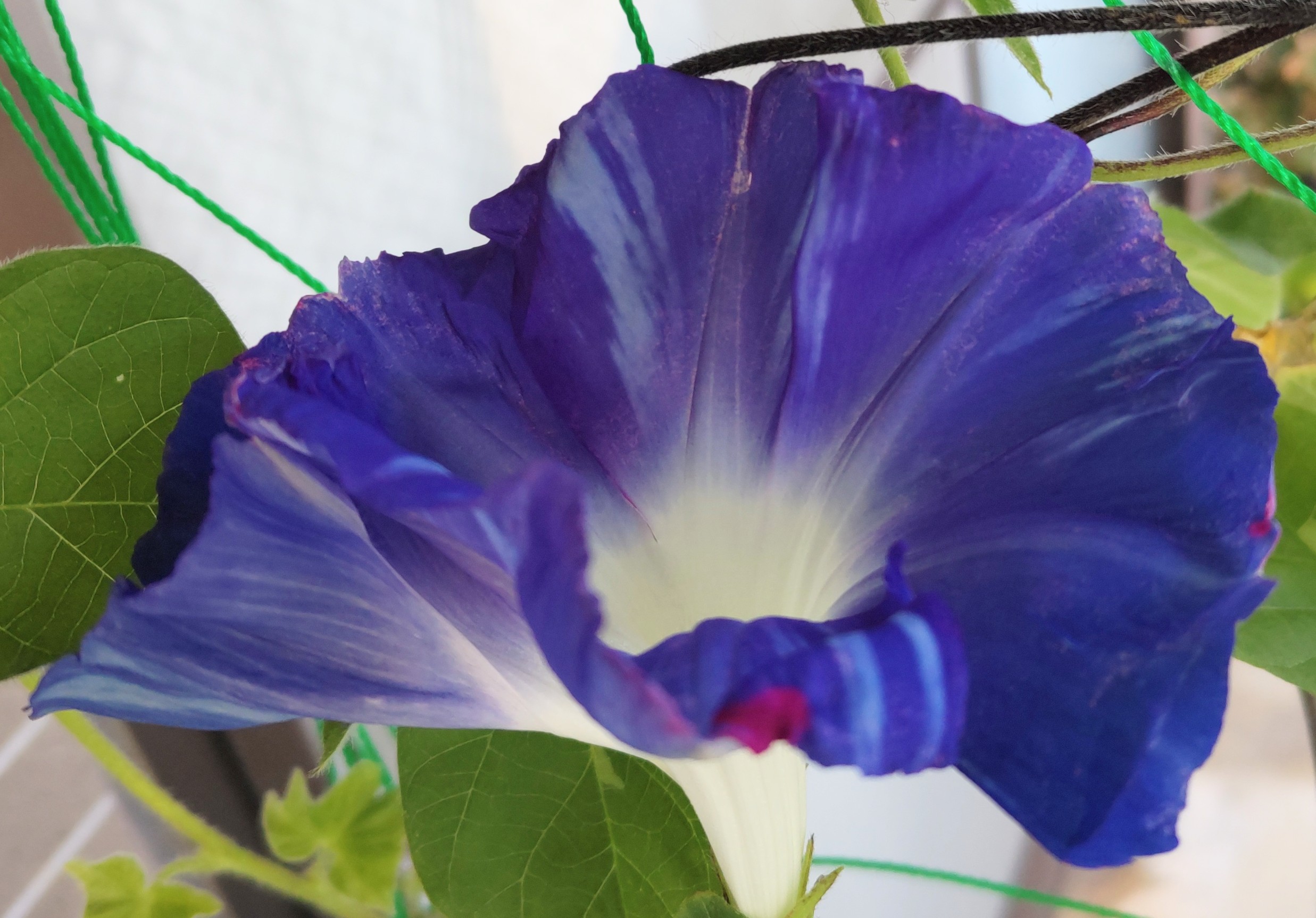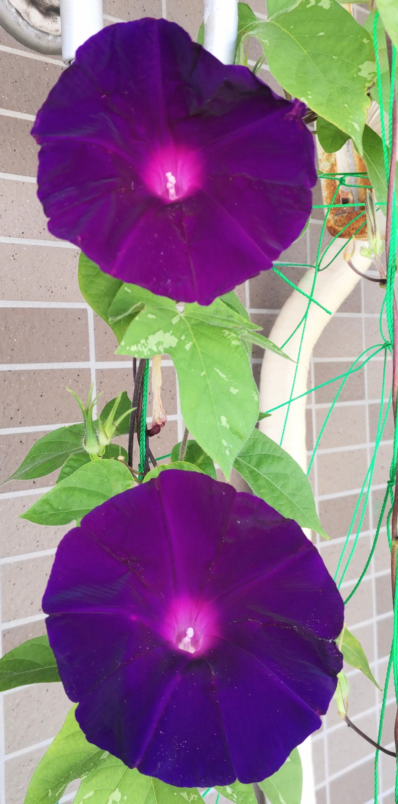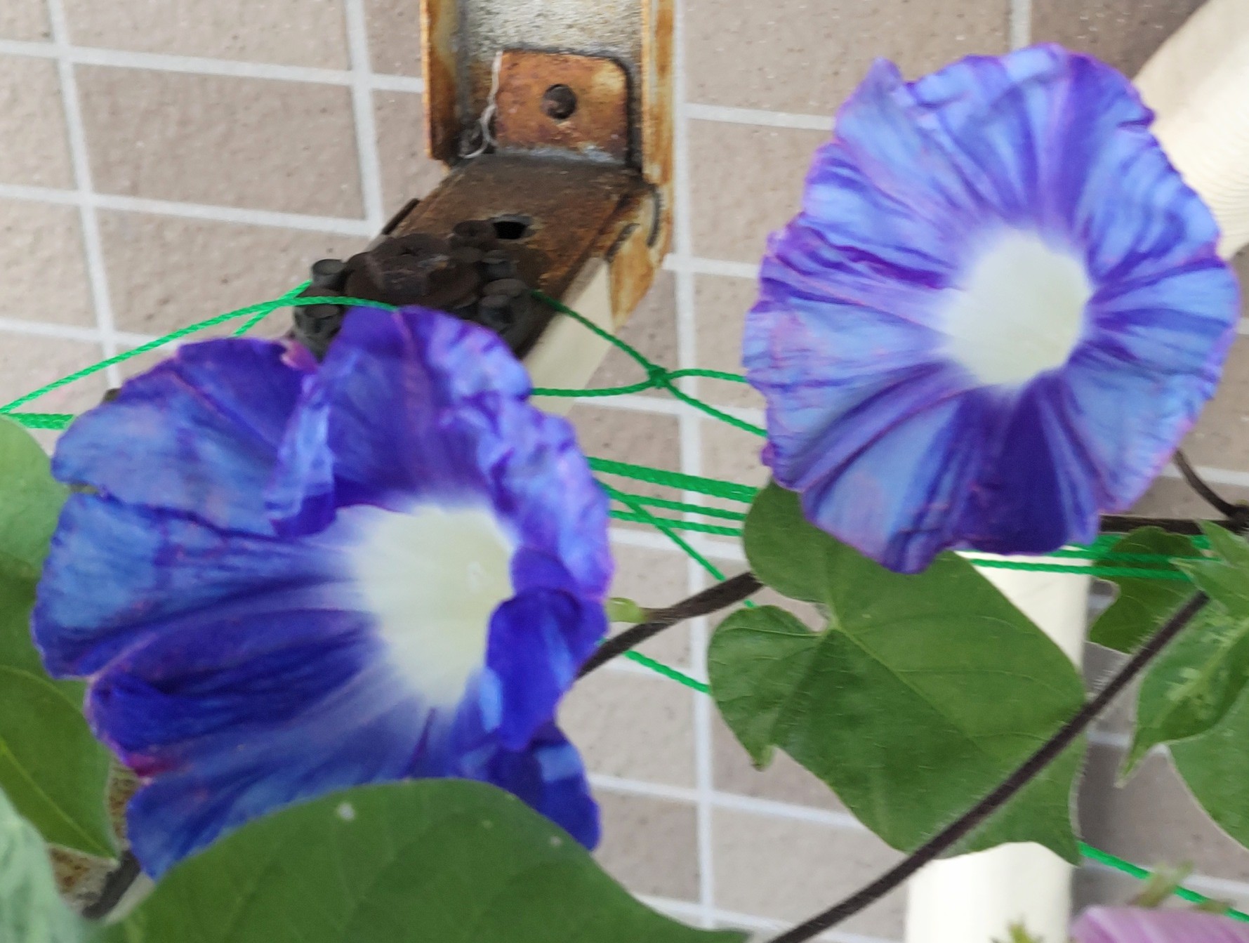 毎日絶望的に暑い日が続くけど、アサガオは日除けが効いてるのか?青いアサガオも開花を続けている。が、やっぱり紫化が否めない。