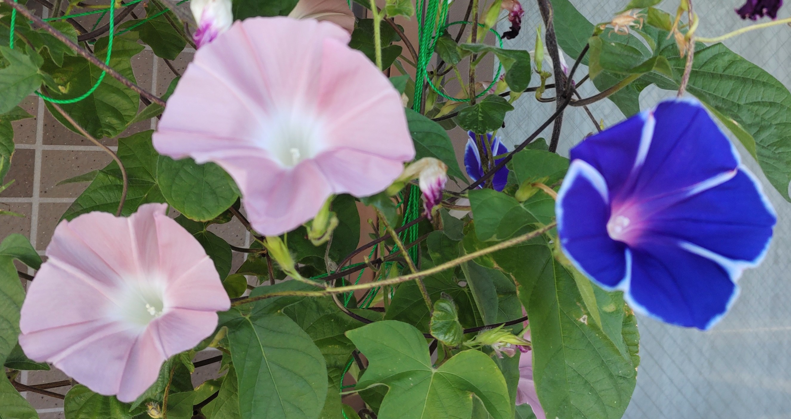 ピンクの初代ダイソーアサガオは、猛暑でも変わらず元気だ。そんな中、暁の海と何かのハーフっぽい種類が開花した(写真1枚目)。いろんな種類を一度に植えるとたまにこういうハーフ花が咲くので、ガチャ的な感覚で開花が楽しみになる。たくさんは開花しないのが残念だが。