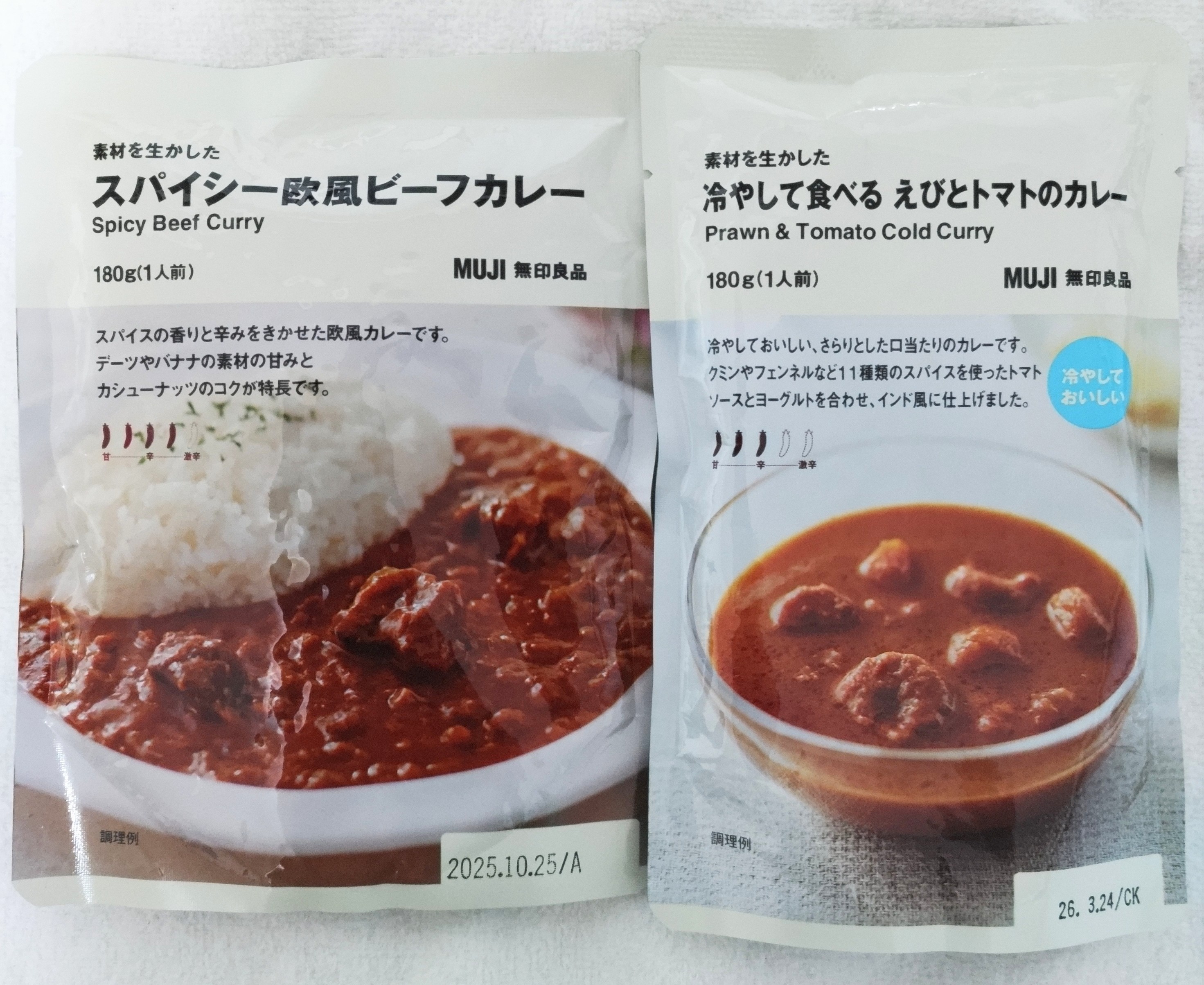夫、もとよりエガちゃんが美味しいと言って好評だったので購入した無印のカレー。写真1枚目の方は私が好みで購入。タイトルにスパイシーと謳ってるだけあって、他のレトルトカレーよりスパイシーだった。普通のレトルトカレーの甘さ加減に飽きたら、こっちを買うのも良いだろう。