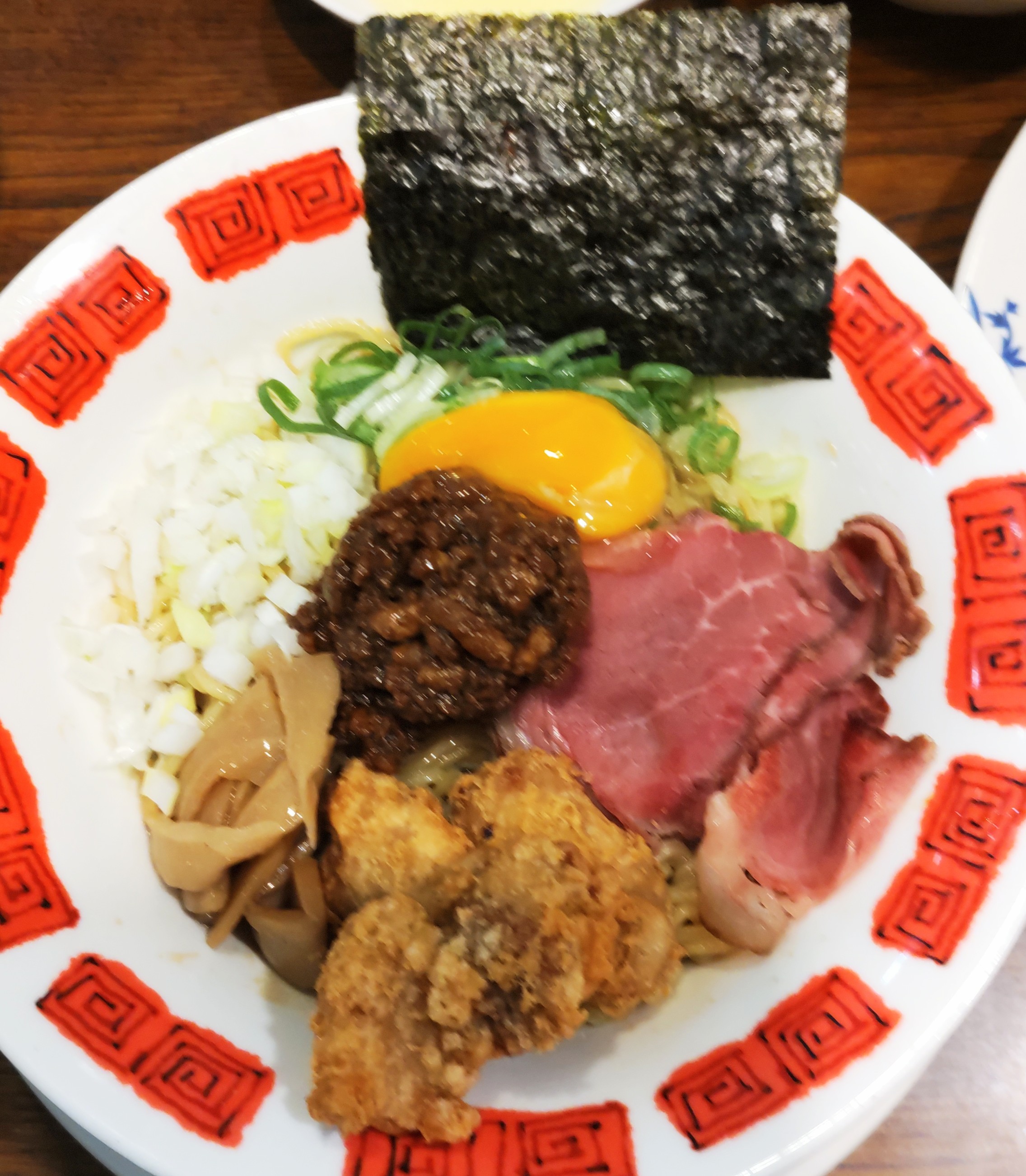 写真1枚目のまぜそばは夫のメインディッシュ。具材は好きな物を選べるようで、肉類をセレクトしていた。エビまるごとシュウマイも、デザートの水レモンゼリーも美味しかった。