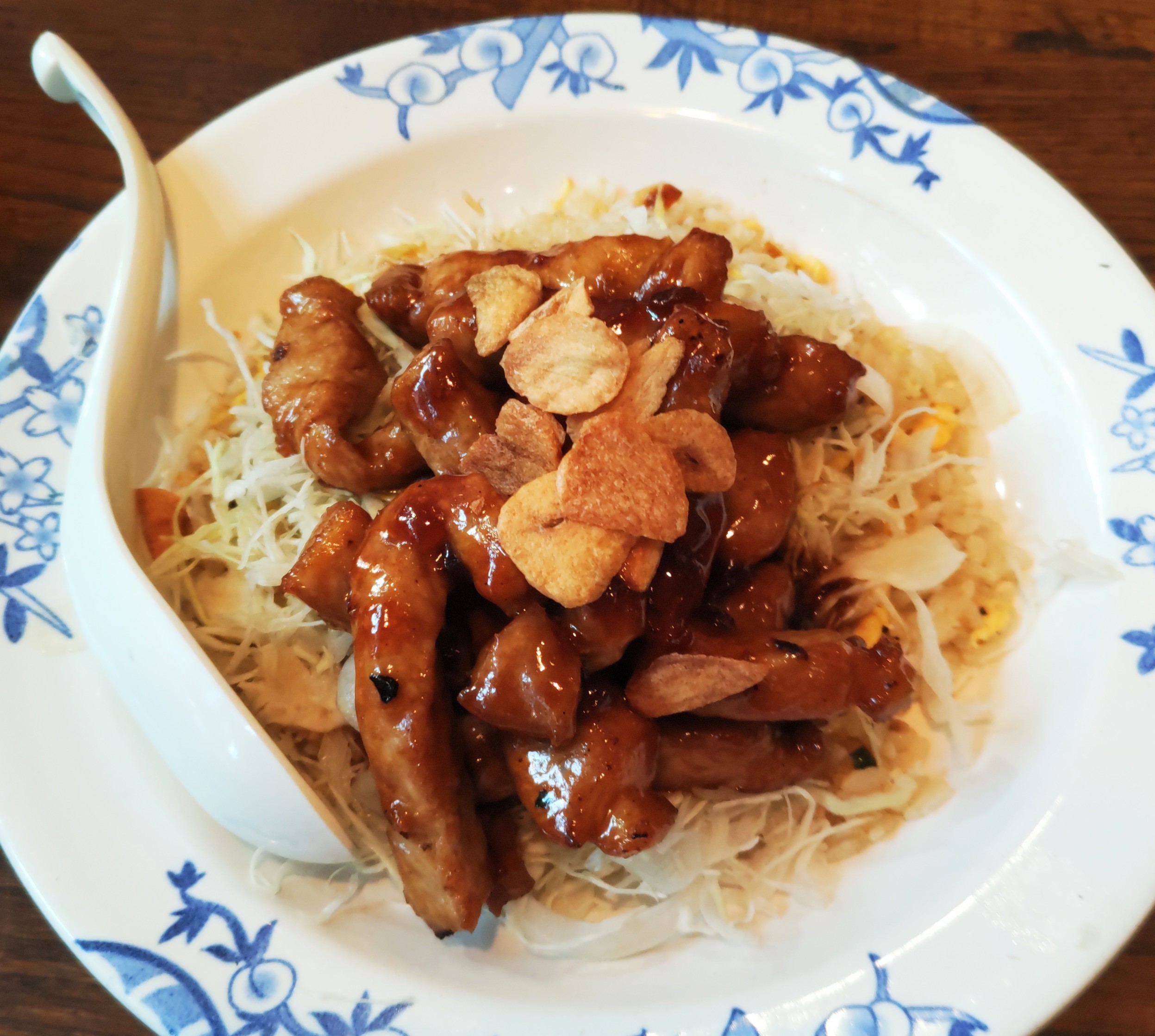 写真一枚目の豚チャーハンは夫が食べた。豚がジューシーで美味しかったようだ。白桃杏仁豆腐は、色が可愛い上においしかった。
