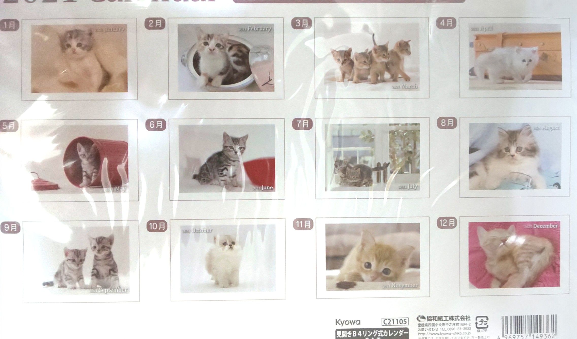 アチコチ外出のたびに探した猫のカレンダーも、結局近所の100均ローソンで解決。ダイソーにあったのは可愛いけど大きすぎるので、大きさもこのぐらいがちょうど良いと思う。