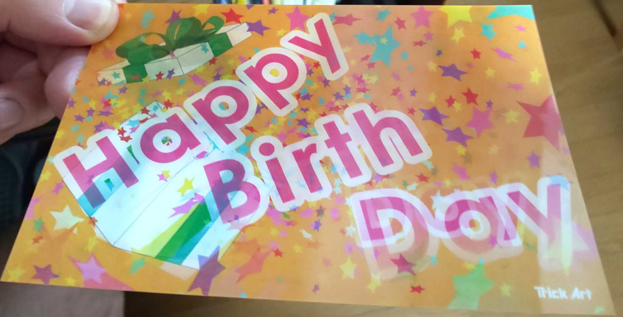 熱海トリックアート館内の土産店で購入。写真は2枚だけど、実際は4パターンあるので、最初と最後だけ載せてみた。プレゼントの箱から、だんだんと星とハッピーバースデーの文字がでっかくなって出てくるという仕組みの絵。これを誰かの誕生日に贈れば、喜ばれること請け合い!