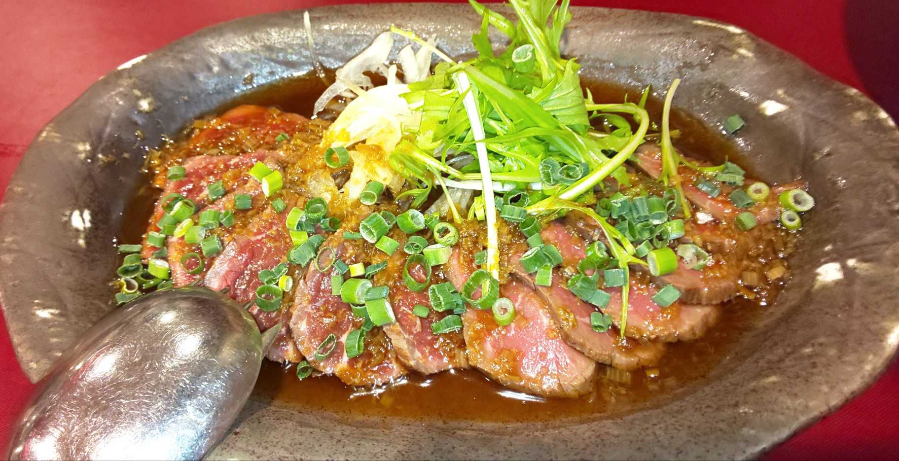 まずは牛モモのたたきから、前回や前々回も食べたお気に入りの前菜。つまりはローストビーフだけど、味付けが和風なので夏でもさっぱりと食べられそうだ。