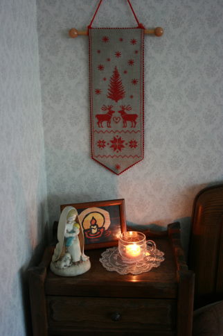 毎年ひとつずつクリスマス用に手作りものを用意していますが、今年はようやく間に合いました。赤一色のクロスステッチで刺繍した聖夜のシーンで、ドイツ語による平和への祈りが添えられています。実は秋の初めから手がけていたのですが、ハイペースで作っていたため、すぐできあがってしまってつまらないかしらと案じたのがいけなかった。途端にやる気がなくなって後回しにしているうちにこれは大変、もうクリスマス目前!大慌てで残りを仕上げました。本来なら裏打ちなどをして、プロにピシっと仕上げてもらうべきところ、間に合わないので今年はあきらめ、仮の額に入れてとりあえず飾りました。というわけで、思いっきり歪んでます(笑)。あまり見ないでね。最初は余裕だったのに結局時間に追われてしまう結果になり反省。のんびり屋の私らしい結末でした。でもクリスマスを待ちながら、ひと針ずつ作り上げていくのはとても楽しい作業です。傍らにはあたたかい飲み物、BGMは大好きなドイツのクリスマスCD。飽きない程度の簡単さと、目に見えて出来上がっていく満足さ。この双方がいい具合にからみあっているからクロスステッチは好きです。ドイツ語とモコモコっとした羊に魅かれました。同じ図案を白一色で作られた人もいましたが、我が家はただでさえ寒いので(笑)、あたたかみのある赤にしました。 こちらは2年前に作った壁掛けです。ノルディックなデザインがお気に入り。クリスマスが終わっても、こちらは冬の間中使えそうな図案です。暗いニュースが多いこの頃ですがせめてお家の中ぐらい、あたたかい色に包まれていたいな。冬の赤、大好きです。