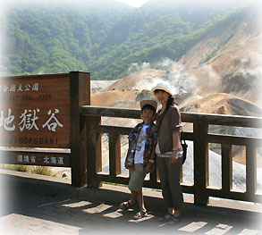 明けて2日目。今日は移動も予定も盛り沢山なので、朝から忙しいです。朝風呂も入らなくちゃならないし、ご飯もいっぱい食べたいしと、気ばかり焦っていたためか、朝食をいただいたテーブルで思い切り太ももを打ちつけた。・・・・・・!!!痛すぎてしばし絶句。みるみるうちに色が変わり、まもなく直系15cmぐらいの大きな楕円形のあざ出現。ス、スゴイ色だ。。。赤と紫と青の見事なグラデーション。もうこれでしばらく水着が着れないわ。登別では地獄谷を見学。硫黄のキョーレツな臭いにもめげず、ぐるりとひと回りしてくる。「これこそ地球が生きている証なのよ!」と私が熱弁してもりょんりょん、鼻をつまむことに気をとられ、聞いているのかどうだか。 さて、一同ニセコへ向かいましょう。登別を出ようとした道の途中で、こんな巨大なオニさん発見。 「か~つ!(喝)」もしくは「アンタ地獄に堕ちるわよ!」なる台詞が合いそう(笑)。信号待ちの車窓からパチリ♪ニセコへのドライブはナビ子におまかせして・・・思ったら、今回搭載のナビ子は、とんでもない食わせ者で、推奨ルートと称して、はぁ~???というような道を平気で教えてくれるヤツだった。これに気づくのが少々遅かったからさぁ大変。ラララ~快適なドライブ♪と思ったのも束の間、突然舗装されていない山道に入り、ぐねぐね山越えとなってしまったのです。対向車が来ないことだけを皆で祈り(まぁこんな所1台も通らないけどさっ!)、不安でいっぱいの道中。たまたま、今回の車は四駆だったからまだよかったけれど、そうでなかったらかなりツラかったかも。この一件から、私達のナビ子に対する扱いは最低ランクのものとなり、悪態の限りをつき出す始末。寄ってたかって悪口を言ういじめっこみたいだ。挙句の果てには「運転して1時間経ったんだから、『お疲れ様♪そろそろ休憩しませんか?(ダーリン♪)』ぐらい言えよな!」←昨年の優秀で慇懃なナビ子は、こう言って休憩に誘っていた。「目的地に着いたら『お疲れ様でした』ぐらい言えないのか、このボケ!」「道を間違えたら無視して黙ってないで、ちゃんと教えろ!どうでもいい時にはベラベラ喋るくせに!」と無茶苦茶なご主人様たち。ナビ子、あと2日しっかり働けよ!とんでもない山道だったけれど、まぁ一応最短距離であったらしく、お昼前にニセコに到着。アウトドアセンターへ向かって、午後のアクティビティの予約を済ませました。普通ニセコでアウトドアというと尻別川でのラフティングが主流ですが、こんな私とあんなりょんりょんが一緒だと、それもままならないわけで、3人で釣りに挑戦することに!大きいダーリンさん、一応趣味をフライフィッシングとうたってはおりますが、その成果が家庭に持ち込まれたことは殆どなく、家族にあまり理解されていないのが実状。さぁ今日こそ、この腕前を発揮して名誉挽回する時が来たぞ!今までさんざん馬鹿にしていたけれど、お前ら見てろよ!俺様の腕前を。そうだ、ついでに奥さんにもやらせてこの面白さを教えれば、ひょっとしたら今後、もっといいことがあるかもしれないな。。。よ~し、ぼかぁ~頑張るぞ~!!大きいダーリンの心情はこんなところだったのではないでしょうか。大好きな映画「リバーランズスルーイット」のブラッドピット気取りでLet"s Go!(身のほど知らずの短足メタボおやじで、ブラビ様許して。) ガイドのJさんと尻別川へ向かい、ポイントを教えてもらいました。このJさん、奥様が岐阜出身で、しかも私達の隣町にあたる所の出ということがわかる。北海道にいながら、何故か地元の話題で盛り上がる私達。最初は3人近くにいたのですが、だんだん自分の世界に入り込み、あのりょんりょんまではるか彼方で一人集中していらっしゃる。すごいなあ。 よ~し、私も頑張らねば。Jさんに教えを乞い、必死になるけれどなかなかうまくいかない。何度もあと少しというところでエサを持っていかれ、そのたびにミミズ箱に手をつっこんではつける作業を繰り返す。最初にJさんに「奥さん、ミミズ平気?」と聞かれた時、「はい、田舎育ちですから、これぐらいのイトミミズなら。」と答えてしまった手前、ミミズを触ってきゃあって言えないところがいとかなし。それに自称田舎育ちのプライドが、それを許さないわ。そのうちJさんが「奥さん、大物狙おうよ、でっかいサツキマス!」と言い出し、「ぼくね、サツキマスが釣れたら、その写真を今度のパンフレットに使いたいの。だから今日カメラ持ってきたから、奥さん絶対釣ろう!」って大はりきり。この時、すでにお約束の3時間はとうに過ぎ、すでに辺りは夕方の気配。追加料金払うのはちょっとな~と思いつつ「でもお時間いいんですか?」と訊ねると、「ぼくは大丈夫、センターには連絡しておくし。もうこれからは趣味の時間よ」という調子。それならやりましょうと私ももうひと頑張りすることに。夕方はお魚たちが活発に動き出すゴールデンタイム。