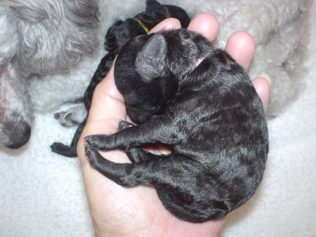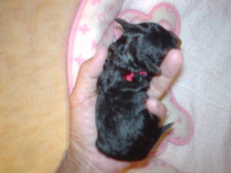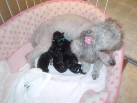 9時50分、第1子を生んでから、約2時間の間に元気な赤ちゃん4匹を生んでくれました。新たな生命に感動してます。へへへへ**********へへへへへ**********へへへへ無事こうして出産をさせることが出来たのも友人(ショコラララさん)はじめ、皆さんの暖かい助言や励ましのお陰で無事、助産婦を務めることが出来たと思っています。本当にありがとうございました。これからも宜しくお願います。へへへへ**********へへへへへ**********へへへへ生まれた4匹の赤ちゃんは、黒かグレーの男の子2匹、女の子2匹です(^-^)体重を測るときに撮影!!!どの、赤ちゃんもこんな感じです。なにをとっても可愛いの一言!!!こんなに小さくても元気に動くんですよねぇ☆☆でも、これからが肝心なので、可愛さだけに没頭せずしっかり保健師役を勤めなきゃ♪♪ 9:50・・・・第1子・・・女の子・・・110g10:30・・・・第2子・・・男の子・・・100g10:40・・・・第3子・・・女の子・・・100g11:09・・・・第4子・・・男の子・・・ 90gハノンは甘えっ子だったので、出産や育児をしてくれるのか凄く心配でしたがしっかり、ノンママになってました~O~/ビックリしたのは、出産中危ないかなと思い、ハノンの目の前にある赤ちゃん箱に 先に生まれた子を移動させると、なんとも素早い早業で (@o@)ウァォ 口にくわえ産箱に戻しちゃうんです。母性って凄いですねぇ☆☆ !!!赤ちゃん達のキュ~キュ~と泣く時間の間隔が長くなりました。 ちゃんとお乳が出始めたのかなぁ???でも、出産後、ハノンはお水を飲んでる気配がないんですよ。フードは少し食べけと゜・・・ このままでいいんでしょうか???それに、今の産箱は小さいので変えようと思うんですが、早めに変えた方がいいのか、少し落ち着いてから変えた方がいいのか迷ってます。早速ですが、あんな話、こんな話をお聞かせ下さい♪宜しくお願いします。