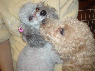 最近、やたらと多いアトムのラブラブキッス!!!!!とにかくハノンが大好きらしく、いつも側から離れないアトムです!!!先日時間が無くてハノンのトリミング後をアップできなかったので今回アップしてみました(^-^); 寒そうで可愛そうだけど、手入れが楽な方を選んでしまった私でした(+-+):鳥のようになってしまったハノン(:-:) やっぱり、ちょっと後悔☆今までの室温だとブルブル震えちゃうんですょ(^-^;やっぱり毛皮って暖かいんですね。今日は長女がアトムのトリミングをしたいと言い出し、トリマーさんにチャレンジしました(@o@); 随分楽しんでるわりには変わらな~い。ハノンのお腹の様子です。ここ数日胎児がよく動くんですよ。超感動です。思い出しませんかぁ??退治が動くとき痛かったことを・・・カウントダウンまで25分(^-^)よんでくれて、ありがとうごさいました。皆様にとっても私にとっても、来年は更に良い年であります様に!!!!