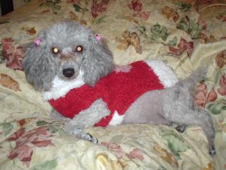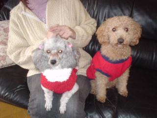 今日はワンズも大大好きなお友達がハノンのお見舞いに来てくれました(^-^)シェットランド・シープドッグとチワワ三匹のママです。なんと、なんと、プーズの洋服をたくさんプレゼントしてくれたのです(@o@)/お見舞いに来てくれるだけでも嬉しいのに・・・・せっかくなので今日からファッションショーをしてみようかと・・・・赤がなかなか似合うでしょ!!! 親バカでごめんなさいm(. .)m (手触れしないデジカメが欲し~いなぁ(;O;)上手く撮れないのが残念!!! スノーマンが可愛いのだぁ~!!!今日のハノンは上機嫌になったせいか、久々におもちゃで遊ぶ姿を見ました。その後、巣作り行動も盛んになりましたぁ・・・・早く生まれてこないかなぁ・・・・♪♪♪