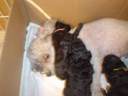今朝も早くから4匹の四重奏で起こされ、寝不足ぎみのスタートとなりました♪もちろん、今日はお昼寝と言うご褒美つき!!!離乳食を食べた後や寝起きにここから出してぇ~~~と キャンキャン、キューキュー^-^;こんな時でもハノンママは気持ち良さそうに熟睡!!そこで登場、アトムパパ・・・どうしたの???ってベビーの元へ今回、パパではお手上げだったらしく、アトムパパは逃げるようにサークルから出てきました。ベビー達を箱から出してあげると・・・ウロウロと探検した後に、ふかふかのカドラーに集合し、毛布を引っ張ったり、おもちゃを噛んだり・・・その後、ハノンママが登場するとどうしてもお乳がほしいようで・・・ポチッとしてね☆最近ずっと、立ったままでお乳をあげるハノンママ♪先週、動物病院へ行った時、先生からあまり長くお乳を飲ませると、予防接種のワクチンが効きにくなると言われ、早く断乳をしたいのです^-^;歯が生えたら自然に断乳できると思っていたのが間違いでしたぁ~~^-^;何か良い方法はありますかぁ???