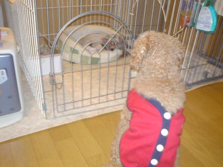 最近のベイビー達は、スヤスヤと寝てくれるのでハノンママはサークルを離れてのびのび☆☆あの、ウルウルお目目で、抱っこをせがまれるとqoo&pooは、つい、メロメロになってしまうのです☆でも・・・この空間にアトムがいると、ベイビーに近づかないようサークルの扉のところで、虎のように威嚇する!!! この時ばかりはアトムもたじたじ^-^;母強しですね☆ アトムが二階に居る時は、ハノンにストレスが掛かると可哀想なのでハノンもサークルの中にいてもらいます。すると、アトムがハノン様を恋しそうに眺めるのですょ。そんな訳で・・・今日はサークルの外で、ご夫婦の面会をさせてみました。クンクンクン☆まずは挨拶☆僕のしゅきなハノンちゃんだぁ~い☆ 遊ぼうょ♪♪私はゆったりしたいの~~♪ねぇ、ねぇ、遊ぼうよぉ~~♪ なのか・・・腰を振り振りしようとするアトムなのです 汗汗汗ここでハノンママから助けて視線が・・・・当面遊べそうにないアトムです。ハノンママは、まだこの時期、ヒートの時のような臭いがあるんでしょうかぁ???アトム君、もう少しの辛抱ですね(^-^;)