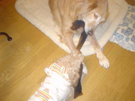 一週間ぶりの更新!!!娘にPCを占領され、日記の更新をしない間ベビー達は更にスクスク育ちしました。サークルから出て遊ぶ内容も、日々進化!!!我が家のクーやアトム達は、歯がカユイ時期が来ると真っ先にスリッパを選んだ!!! 噛みやすい厚さですものね♪きっとね皆さんの家も同じかなぁ~☆「噛む物は他にもあるじゃない」と思っていると食器棚の下の角や椅子の足を噛み始める^-^;まるで挑戦状を突きつけられている様に思えるほど、絶妙なタイミングなのです。でも今回は、ハノンママのおっぱいを噛むことから始まり始まり!!!ノンママも痛さのあまり、低音の声でベビー達に吠えまくるのです。ベビー達もあんなに小さな体で、負けずに吠え返す光景はうるさいけれど、思わずニンマリッ(*^-^*)でもやっぱり・・うるさぁ~~い( 汗)こんな可愛いベビー達をもっと綺麗な画像で保存をしたいと思うあまり、ずっと悩んでいたデジカメの買い替えを決行してしまいました。色々と悩んだ末、Finepix F11にしました!!もっと、早く買い換えれば良かったと決断力のない自分に喝っ!!!週末までには届くといいなぁ~~!!