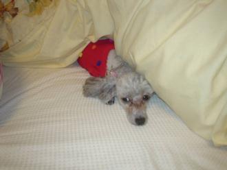 昨日、出産準備のトリミングとレントゲンを撮ってきましたぁ~(^^)トリミングと言っていいのだろうか???頭以外は丸刈りと言う事に・・・プードルって毛が無くなるとまるで別人ならぬ別犬ですよね☆☆その変化がまた可愛いのかも?!トリミングも終わり、次は待ちに待ったレントゲン・・・すぐ先生に呼ばれ診察室へいくと、先生からクイズ!!「さて、何匹いるでしょう??」私・・・「一匹、二匹、三匹・・・・・んっ四匹??」先生・・・「正解~♪♪」 ビックリしすぎて思わず息ができなくなった☆まさか四匹なんて想像もしてなかったので、嬉しいような、出産が心配なようなで・・・(^-^);胎児は順調に育っているとのことで、胎児の大きさも自然分娩に問題ない大きさとのことで、少し不安は解消(~o~)ノンは臆病なので、病院にはなかなか慣れず、今回も緊張しまくりでした。帰宅後はいつもの様にソファで寝ている次女の足を枕に、瞬時で寝てしまったハノン。