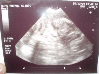 今日の仕事休みを待ちきれず、昨日の夜、掛かりつけの病院へ行ってきました♪♪♪この太り具合は食べすぎではなく、ご懐妊ですょ!おめでとうございますと先生の言葉☆想定外の妊娠と言う事もあり戸惑っていた私ですが、すっかり吹き飛んでしましました☆エコーで見ると、小さな小さな肋骨と背骨や心臓の動きの確認ができて、言葉で表現できない様な感動を味わってきましたd(~o~)b(画像右上の方に白く魚の骨のようなものが背骨と肋骨です)エコーで見る限り3匹はいるだろうとのこと。来週中にレントゲンを撮り、正確な数が確定するそうです。寝ているハノンの頭を枕に・・・犬の世界もご主人様が偉い?と思いきや・・・ハノンママの逆襲?! ママは強くなきゃね。頑張れハノン!寒い時期の出産になってしまったけど、しっかりと知識つけて頑張りま~すさて、想定外の訳とは・・・1)アトムもハノンも初めて同士・・・2)個体差があるので人の手を借りずには無理かなと思っていた・・・3ヒートの始まりは分からなかったけれど、隔離やパンツを履かせ防いだつもりだった・・・4)ハノンはいつも拒否している様子だった・・・アトム君いつの間に・・・です。でも、来春にはハノンとアトムのパピーが欲しかったので、家族揃って大喜びです☆☆☆ 楽しみ♪♪♪