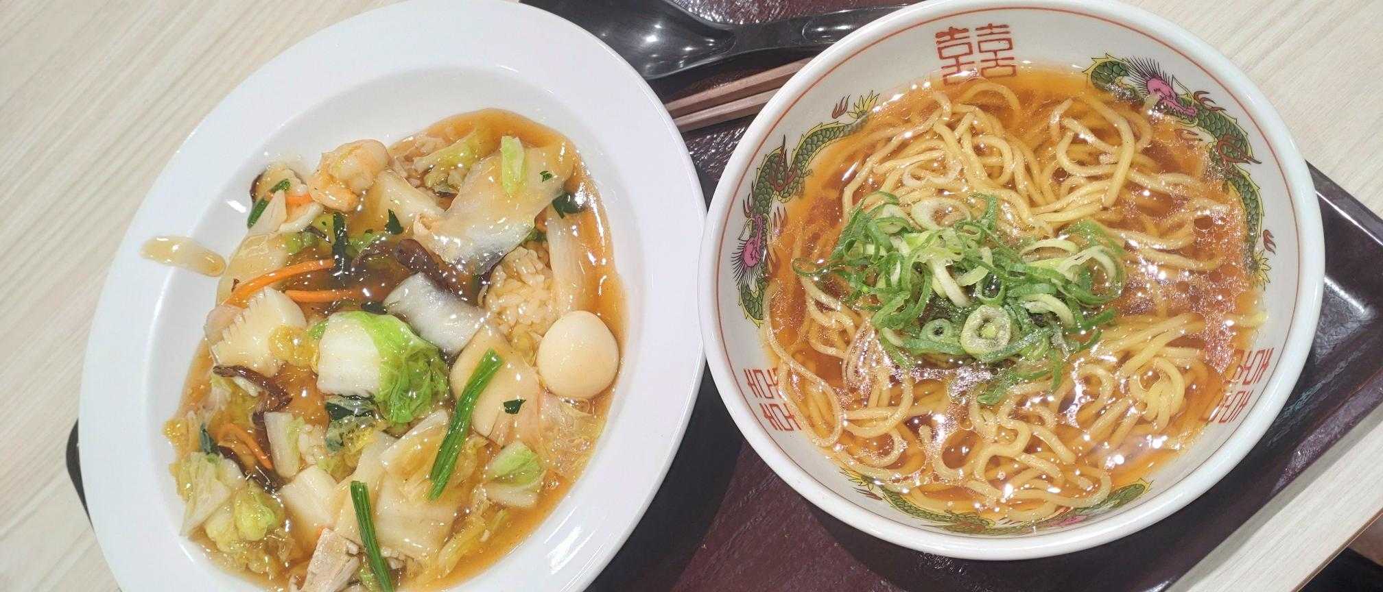 いつもはラーメンにするけど今日は中華飯セットにしてみた。(以前のブログ)写真だとラーメンが一人前みたいに見えるけど半ラーメンなので量は少ないし、葱だけの具材。野菜たっぷりの中華半は熱熱で美味しかった。