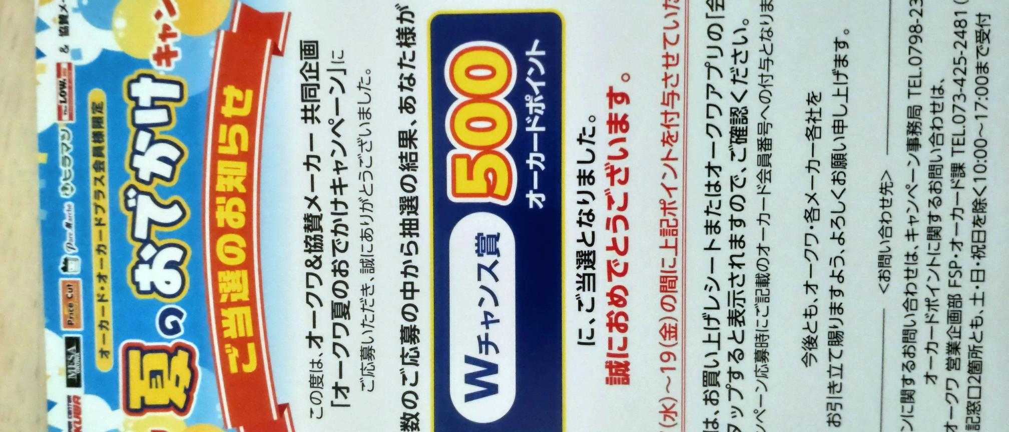 旅行が当たる懸賞のWチャンス賞に当選。(以前のブログ)500円分なのでありがたいです。