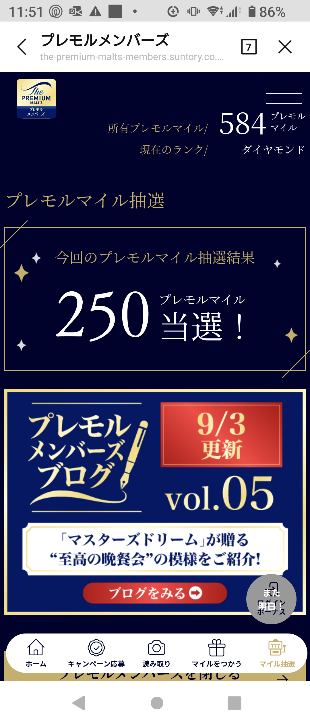 ログインポイントやビールを買った時のポイントを貰っても最大5ポイント(5円分)だったのに初めて250ポイント当たった!サントリーさ~ん、ありがとうがざいま~す。