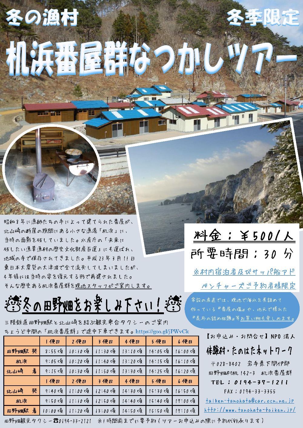 冬季限定で、村内宿泊及びサッパ船アドベンチャーズご予約のお客様限定の格安ガイドを実施しています。冬期間の田野畑村を少しでも楽しんでいただけるよう、机浜番屋群に事務所を置く体験村たのはたのスタッフがご案内します。【ツアー内容】震災前の昭和初期からの机浜番屋群の話や、漁具の話。震災で流失してしまってから再建された現在の話等。料金はお一人様500円所要時間は30分なので、どなたでもお気軽にご参加いただけます。ガイド後机浜番屋群をご自由に散策いただけます。常設の産直でしか買えない、楽しめないものもありますので、是非この機会に机浜番屋群を訪れて懐かしさに浸ってみませんか?また、公共交通機関でお越しのお客様には、のりあいタクシーのご予約を代行してくれます。詳しくは、体験村たのはたへお問い合わせください。「お問い合わせ・お申し込み先」NPO法人 体験村・たのはたネットワーク住所 田野畑村机142−3 机浜番屋群Tel 0194-37-1211Mail taiken-tanohata@car.ocn.ne.jpリンク先 http://www.tanohata-taiken.jp/index.html