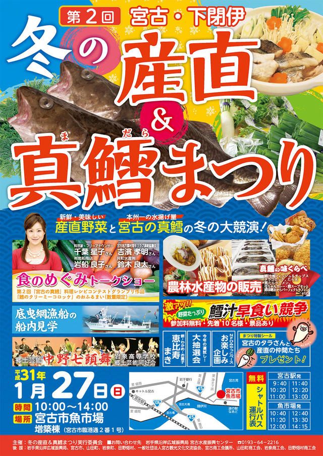 新年明けましておめでとうございます。旧年中のご厚情に心より感謝申し上げますとともに、本年も何卒よろしくお願い申し上げます。それでは、今年最初のイベント情報です!物産販売、飲食の販売、ステージショーとイベント盛りだくさんです。冬の旬をお楽しみください。【お問い合わせ先】沿岸広域振興局水産部宮古水産振興センター 水産振興課 漁政チーム電話番号:0193-64-2216(内線番号:315)