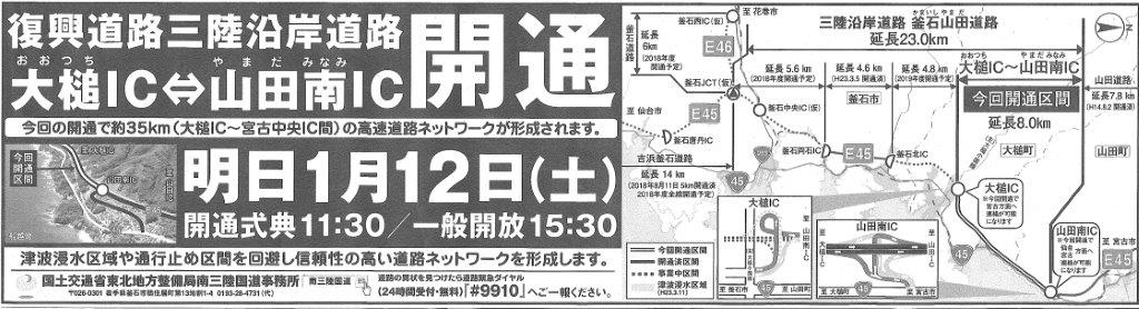 E45 大槌IC⇔山田南I.C 8Km区間 1月12日(土)午後15時30分より開通!従来の国道45号線より、約6分ほどの短縮が見込まれています!従来の国道45号線だけで田野畑村と釜石市までは、車で約2時間30分ほどかかっていましたが、昨年の岩泉小本⇔田老間の開通も合わせると約2時間ほどで移動が可能となります!さらに、今年の春ごろには釜石両石ICより先の区間も開通予定とのことです!東北自動車道の花巻ICや花巻空港・遠野方面の釜石道路とも直結となりますので、ますます内陸と三陸が近くになります。1年後の冬のシーズンは、盛岡よりR455、R106を使って三陸ではなく、花巻より釜石経由で三陸にお越しの方が、安全で便利になってくると思います。「今後の三陸」①3月23日 三陸リアス線開業! ②6月1日~8月7日 三陸防災復興プロジェクト2019③9月25日&10月13日 ラグビーワールドカップ2019今年もどうぞ、みなさまのご支援・お越しをお待ちしております。(補足)1/11岩手日報朝刊より画像を参照しました。