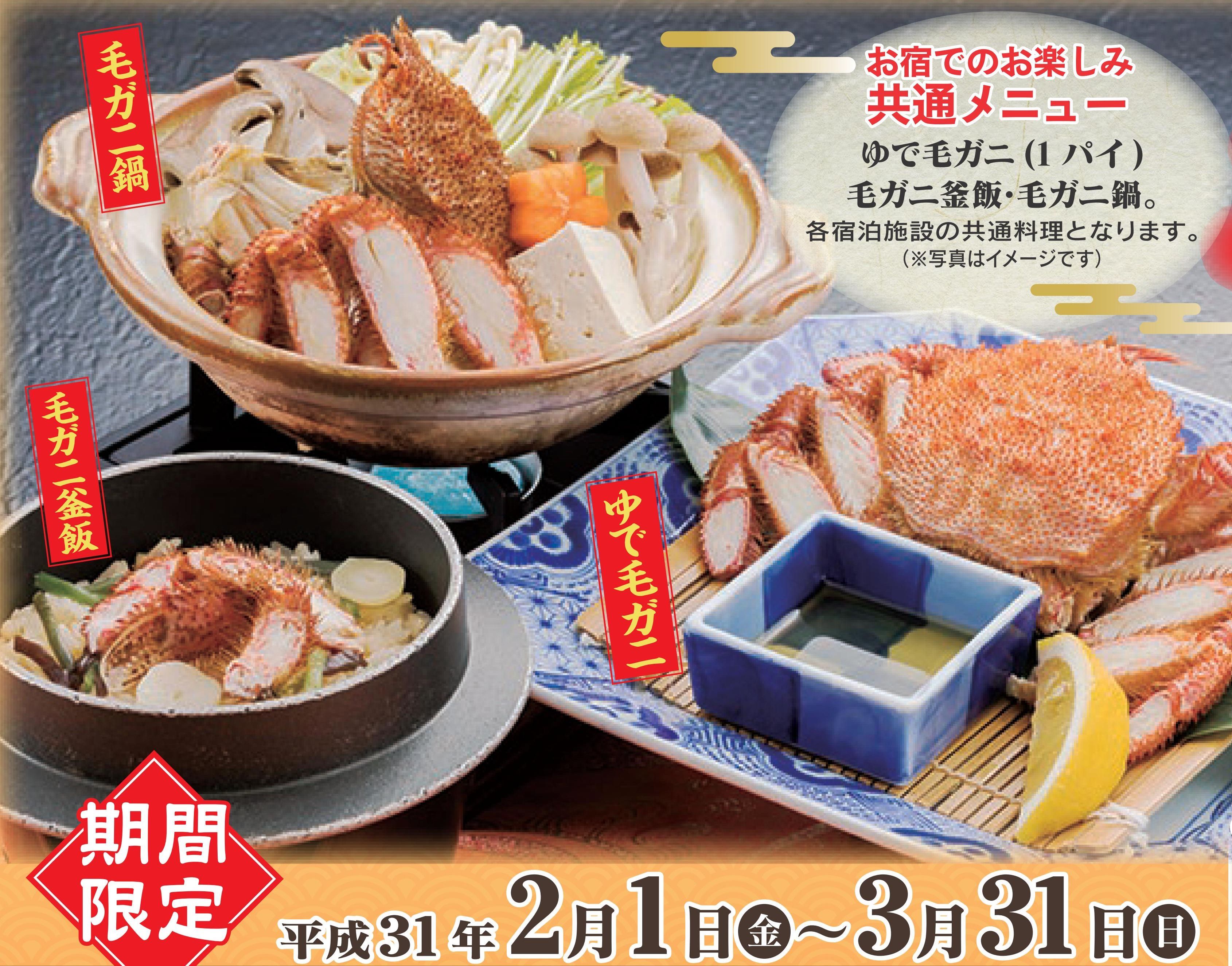 『魚彩王国』に加盟しているお宿共通のお得な宿泊パックのご案内です。【期間限定】 今が旬!冬の味覚を堪能!宿泊料金もお得にご案内致します!(休前日も同料金でOK!)当ホテルは、3名様1室以上で10,800円(サ込税込)2名様1室時は、11,880円となります。【ご夕食】◆メイン料理◆毛ガニの浜茹で(1パイ)、毛ガニ釜飯、毛ガニ鍋。北海道の毛ガニに比べて、三陸特有の小ぶりサイズですが、身はパンパンにつまっています。身の味は美味しく、カニ味噌も濃くてオススメです。このほかに宿おまかせ海鮮膳とともにお楽しみください。◆会場 基本的にイス席の会食場になります。18:00 open (最終入場19:30迄可能)※お子さま膳(宿泊料70%)でも、ゆで毛ガニ(半身)、毛ガニ釜飯、毛ガニ鍋をご用意。 ※漁の状況により入手が困難な場合、内容が変更になる場合がございます。3月3日(日)は、毎年恒例の『宮古毛ガニまつり』も予定されております。ぜひ、冬の三陸をご堪能ください!