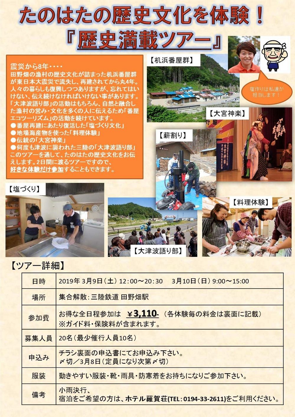 塩づくりや料理体験、大津波語り部など田野畑の歴史文化を体験してみませんか。■スケジュール3月9日(土) 12:00 三陸鉄道田野畑駅集合 → 机浜番屋群へ移動12:10 塩づくり体験(海水汲み/着火/薪割り体験 等) ~16:30 17:00 ホテル羅賀荘チェックイン(※各自で宿を御予約ください)19:30 大宮神楽鑑賞 ~20:303月10日(日)9:00 机浜番屋群集合塩づくり体験(最終煮詰め作業 等) ~10:3010:30 番屋料理体験(昼食づくり) ~12:1512:15 塩づくり体験(塩すくい/乾燥作業/袋詰め体験 等)~13:30 →三陸鉄道田野畑駅へ移動14:00 大津波語り部(14:46黙とう) ~15:00 解散■集合・解散場所三陸鉄道 田野畑駅■定員20名■参加費全日程参加の場合 □ ¥3,110円3/9 □(A)塩づくり ¥1,000 □(B)神楽鑑賞 ¥5003/10 □(C)塩づくり ¥1,000 □(D)昼食づくり ¥1,000 □ 大津波語り部 ¥01泊2日のツアーですが、ご希望の体験だけ、美味しいところだけお楽しみいただくこともできます。■締切3月8日(金) ※定員になり次第締切■申し込み・お問い合わせ先体験村・たのはたネットワーク(TEL:0194-37-1211)