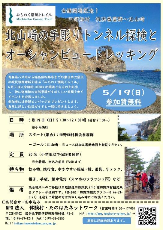 サッパ船や津波語り部などを運営している「NPO法人体験村たのはた」では、みちのく潮風トレイル全線開通を記念したトレッキングイベントが、5月19日(日)に開催されます。北山崎の迫力ある岩々を貫く隧道と美しい海岸線の景色を楽しみながら歩いてみませんか!?(裏面)