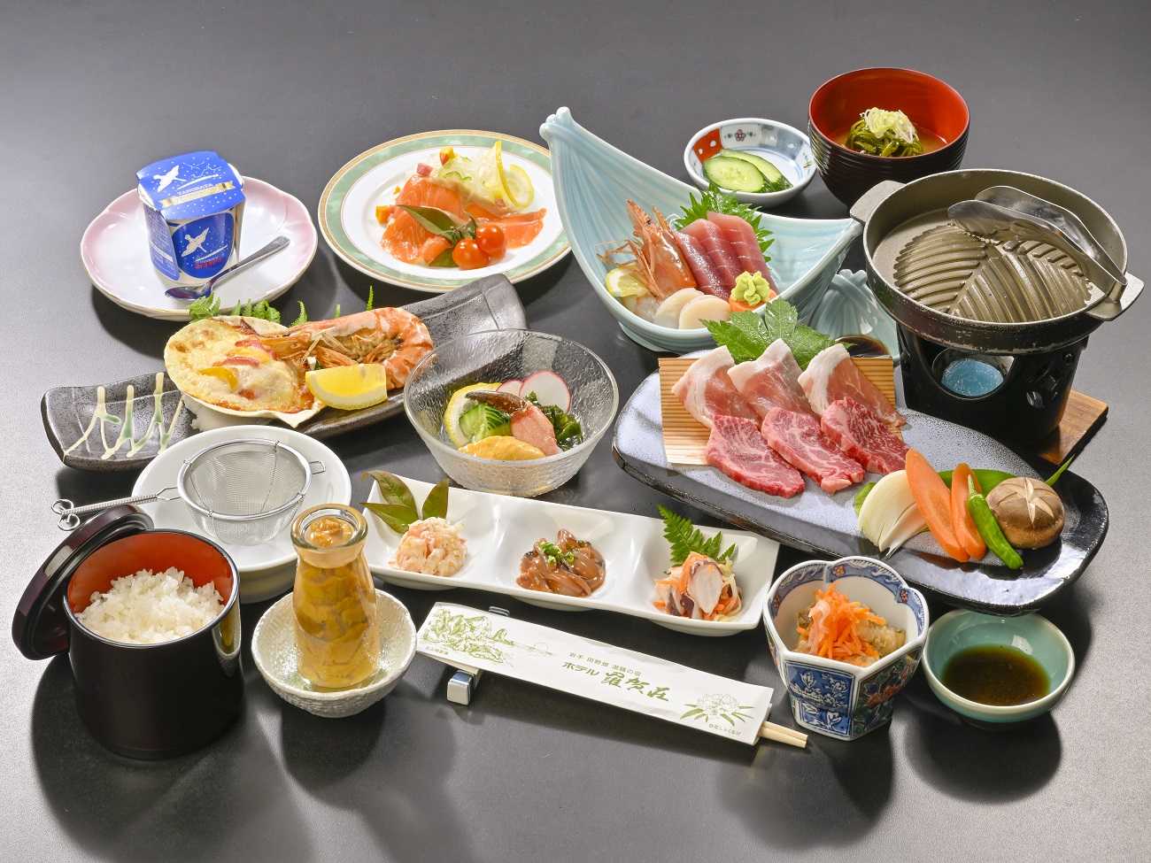 (一例)三陸産海鞘、三陸サーモン、旬のお刺身3種、海老の鬼殻焼きと海鮮グラタン、県産和牛と龍泉洞黒豚の鉄板焼き etc...